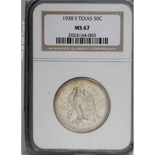 <B>1938-S<50C> Texas MS67 NGC.</B></I> A sharply struck and lustrous example with pearl-gray centers and russet peripheral toning. The surfaces of this Superb Gem are extremely well-preserved. Census: 59 in 67, 8 finer (6/06).