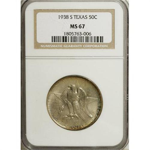 <B>1938-S 50C Texas MS67 NGC.</B></I> Light, even gray toning covers each side with iridescent highlights around the margins. The underlying mint luster is bright and enlivens the overlay of color. An exceptionally pleasing Texas commemorative. Nearly perfect.<BR><BR><b>Shipping:</b> Coins & Currency (<a target="_blank" href="http://www.heritageauctions.com/common/shipping.php">view shipping information</a>)