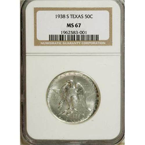 <B>1938-S 50C Texas MS67 NGC.</B></I> A subtly lustrous silver-white Superb Gem that offers pleasing definition and virtually pristine surfaces. NGC has graded a mere nine numerically finer pieces (3/08).<BR><I>From The Silver Spur Collection.</B></I><BR><BR><b>Shipping:</b> Coins & Currency (<a target="_blank" href="http://www.heritageauctions.com/common/shipping.php">view shipping information</a>)