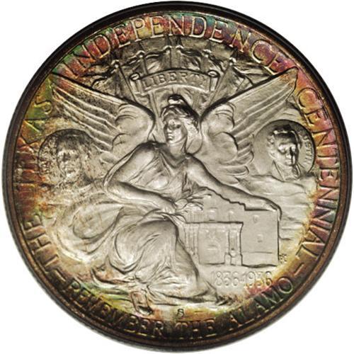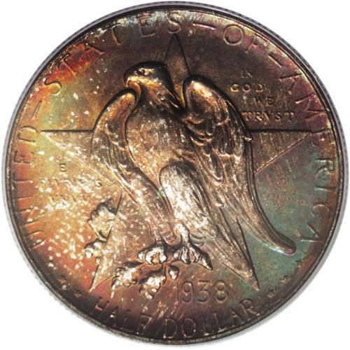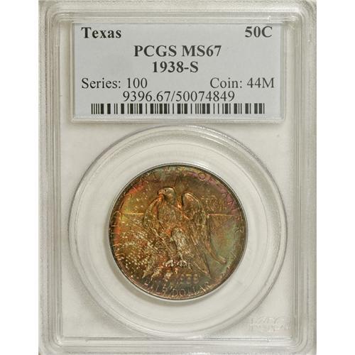 <B>1938-S 50C Texas MS67 PCGS.</B></I> Spectacular waves of orange, apple-green, and ruby-red color drape the obverse. The reverse border exhibits alternating sections of original gold, rose, aqua, and powder-blue patina. A carefully preserved Superb Gem that has satiny luster and a bold strike. The 1938 Texas issues have the three lowest mintages for the series, with just 3,814 examples coined at San Francisco. Population: 42 in 67, 1 finer (3/07).<BR><I>From The Cary & Cheryl Porter Collection.</B></I><BR><BR><b>Shipping:</b> Coins & Currency (<a target="_blank" href="http://www.heritageauctions.com/common/shipping.php">view shipping information</a>)