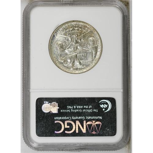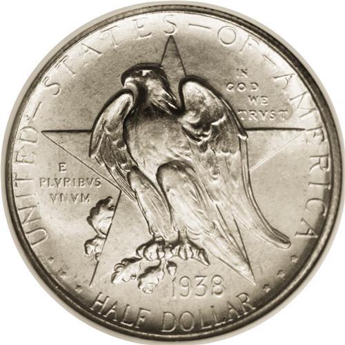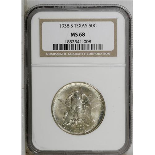 <B>1938-S<50C> Texas MS68 NGC.</B></I> The Texas type ended its five-year run in 1938. As in the prior four years, PDS sets were issued, but reduced collector interest led to the lowest set mintages for the type. This lustrous and precisely struck Superb Gem has lovely light gold and ice-blue toning. Nearly imperceptible thin marks on the eagle's knees deny perfection. Census: 9 in 68, 0 finer (9/06).