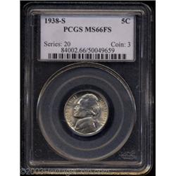 <TABLE cellSpacing=0 cellPadding=0 width="100%" bgColor=#000000 border=0><TBODY><TR><TD width="100%"><TABLE cellSpacing=1 cellPadding=3 width="100%" border=0><TBODY><TR><TD width="100%" bgColor=#79735c><FONT face=arial color=#ffffff size=3><B>Description</B> </FONT></TD></TR><TR><TD width="100%" bgColor=#ffffff><FONT face=arial size=2><B>1938-S 5C MS66 Full Steps PCGS.</B></I> Fully struck with glowing satiny luster and bright olive-gold color. There are two or three small contact marks, on Jefferson's portrait, and a spidery die crack (as struck) along Jefferson's scalp. Population: 6 in 66, 2 finer (8/03). </FONT></TD></TR></TBODY></TABLE></TD></TR></TBODY></TABLE><BR><A name=PricesRealized></A><TABLE cellSpacing=0 cellPadding=0 width="100%" bgColor=#000000 border=0><TBODY><TR><TD width="100%"><TABLE cellSpacing=1 cellPadding=3 width="100%" border=0><TBODY><TR><TD width="100%" bgColor=#79735c><A name=PR><FONT face=arial color=#ffffff size=3><B>Previous Prices from Heritage Auctions</B> </FONT></A></TD></TR><TR><TD bgColor=#f6f6ed><TABLE cellSpacing=0 cellPadding=0 width="100%" border=1><TBODY><TR><TD align=middle width="33%"><B>Date</B></TD><TD align=middle width="33%"><B>Service</B></TD><TD align=middle width="33%"><B>Price</B></TD></TR><TR bgColor=whitesmoke><TD width="33%"><B>02/18/2003</B></TD><TD width="33%">ANACS</TD><TD width="33%">$437.00</TD></TR></TBODY></TABLE></TD></TR><TR><TD bgColor=#ffffff><FONT face=arial size=1 ?>PLEASE NOTE: All prices realized reflect the final hammer price PLUS the buyer's premium in auctions that charge a buyer's premium. Each item has a notation at the top of the listing indicating whether that lot included a buyer's premium. Example: A item that sells with a final hammer price of $100 and a 20% buyer's premium will display with a price realized of $120. All information listed is intended to be as accurate as possible, but errors are possible. Please use this guide carefully and inform us of any inaccuracies. </FONT></TD></TR></TBODY></TABLE></TD></TR></TBODY></TABLE><BR><TABLE cellSpacing=0 cellPadding=0 width="100%" bgColor=#000000 border=0><TBODY><TR><TD width="100%"><TABLE cellSpacing=1 cellPadding=3 width="100%" border=0><TBODY><TR><TD width="100%" bgColor=#79735c colSpan=6><FONT face=arial color=#ffffff size=3><B>Price Guide*</B> </FONT></TD></TR><TR bgColor=#f6f6ed><TD align=middle><B>Grade</B> </TD><TD align=middle><B>Coin World<BR>(Trends)</B> </TD><TD align=middle><B>Numismedia<BR>Retail</B> </TD><TD align=middle><B>Numismedia<BR>Wholesale</B> </TD><TD align=middle><B>Coin<BR>Universe</B> </TD><TD align=middle><B>Heritage<BR>Value Index</B> </TD></TR><TR bgColor=#ffffff><TD align=middle>65</TD><TD align=right>---</TD><TD align=right>---</TD><TD align=right>---</TD><TD align=right>---</TD><TD align=right>---</TD></TR><TR style="FONT-WEIGHT: bold" bgColor=#cccfdd><TD align=middle>66</TD><TD align=right>---</TD><TD align=right>---</TD><TD align=right>---</TD><TD align=right>---</TD><TD align=right>---</TD></TR><TR bgColor=#ffffff><TD align=middle>67</TD><TD align=right>---</TD><TD align=right>---</TD><TD align=right>---</TD><TD align=right>---</TD><TD align=right>---</TD></TR><TR bgColor=#ffffff><TD colSpan=6><FONT size=1>*All information listed is intended to be as accurate as possible, but errors are possible. No item may be returned or refused based on this information which is provided as a service to our customers. You should contact each pricing source directly to determine the accuracy of this information. </FONT></TD></TR></TBODY></TABLE></TD></TR></TBODY></TABLE><BR><TABLE cellSpacing=0 cellPadding=0 width="100%" bgColor=#000000 border=0><TBODY><TR><TD width="100%"><TABLE cellSpacing=1 cellPadding=3 width="100%" border=0><TBODY><TR><TD width="100%" bgColor=#79735c><FONT face=arial color=#ffffff size=3><B>Population Guide</B> </FONT></TD></TR><TR bgColor=#ffffff><TD align=middle><!-- Begin Output of Population Grid--><TABLE cellSpacing=0 cellPadding=0 width="100%" border=0><TBODY><TR><TD vAlign=center><TABLE cellSpacing=0 width="100%" border=1 cellsadding="3"><TBODY><TR><TD vAlign=center><TABLE cellSpacing=0 cellPadding=3 width="100%" border=1><TBODY><TR><TD vAlign=center align=middle bgColor=#f0f1e8 colSpan=2 <CENTER><FONT face=Arial size=2><B>PCGS Pop </B></FONT><CENTER></CENTER></TD><TD vAlign=center align=middle bgColor=#f0f1e8 colSpan=2><CENTER><FONT face=Arial size=2><B>NGC Pop</B></CENTER></FONT></TD></TR><TR><TD vAlign=center><FONT face=Arial size=2>(66)</FONT> </TD><TD vAlign=center align=right><FONT face=Arial size=2>6</FONT> </TD><TD vAlign=center><FONT face=Arial size=2>(66)</FONT> </TD><TD vAlign=center align=right><FONT face=Arial size=2>0</FONT> </TD></TR><TR><TD vAlign=center><FONT face=Arial size=2>(>66)</FONT> </TD><TD vAlign=center align=right><FONT face=Arial size=2>2</FONT> </TD><TD vAlign=center><FONT face=Arial size=2>(>66)</FONT> </TD><TD vAlign=center align=right><FONT face=Arial size=2>0</FONT> </TD></TR></TBODY></TABLE></TD></TR></TBODY></TABLE></TD></TR></TBODY></TABLE><!-- End Output of Population Grid--> Important notice: Heritage usually auctions material at the rate of 200-250 lots per hour. On some occasions eBay Live bid software or the Internet may not be able to keep up with the pace of the auction. We recommend placing a realistic absentee bid now as insurance to avoid disappointment. Occasionally the auctioneer may eliminate or reject an eBay Live bid, and the auctioneer may also reopen a lot after the close of the eBay live bidding (usually because we missed an audience bid), and may reject your bid even if it shows you as the winning bidder. By bidding via eBay Live, you agree that Heritage may award the lot to another bidder at its sole discretion under the circumstances described above or any other reasonable circumstances. Also please note that all Heritage lots purchased through eBay Live carry a 20% Buyer's Premium. Please make sure you read the Terms and Conditions before you bid.</TD></