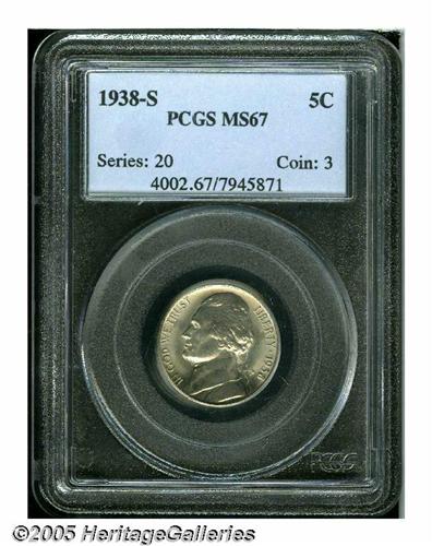 <B>1938-S<5C> MS67 PCGS.</B></I> Lightly toned with clean surfaces, this beautiful Superb Gem is seemingly pristine, displaying a marvelous degree of mint luster, and some subtle toning variations on the reverse. No blemishes can be found, and the original design features have been fully raised by a monumental strike. Population: 20 in 67, 0 finer (4/05).<BR><I>From The Western Hills Collection.</B></I>