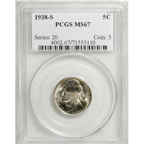 <B>1938-S 5C MS67 PCGS.</B></I> PCGS Population (22/0). NGC Census: (248/1). Mintage: 4,105,000. Numismedia Wsl. Price for NGC/PCGS coin in MS67: $180. (#4002)<BR><BR><B>Coin Engraver:</B> Felix Schlag<BR><BR><b>Shipping:</b> Coins & Currency (<a target="_blank" href="http://www.heritageauctions.com/common/shipping.php">view shipping information</a>)