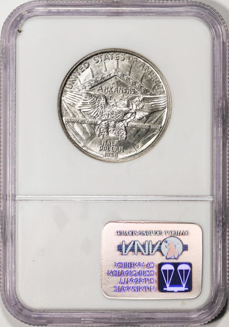 One 1938-S Arkansas Centennial Commemorative Half Dollar Coin NGC MS66. NGC Certified.