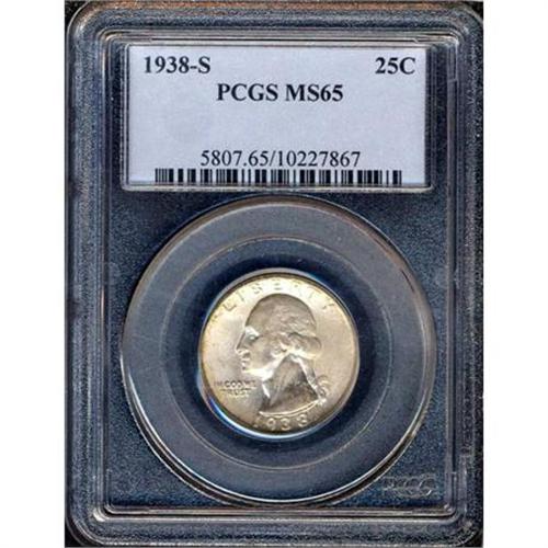 <b>1938-S Washington Quarter Dollar. PCGS graded MS65.</b> Frosty white luster just grazed by natural toning in a few places <b>(PCGS # 5807)</b> <i>