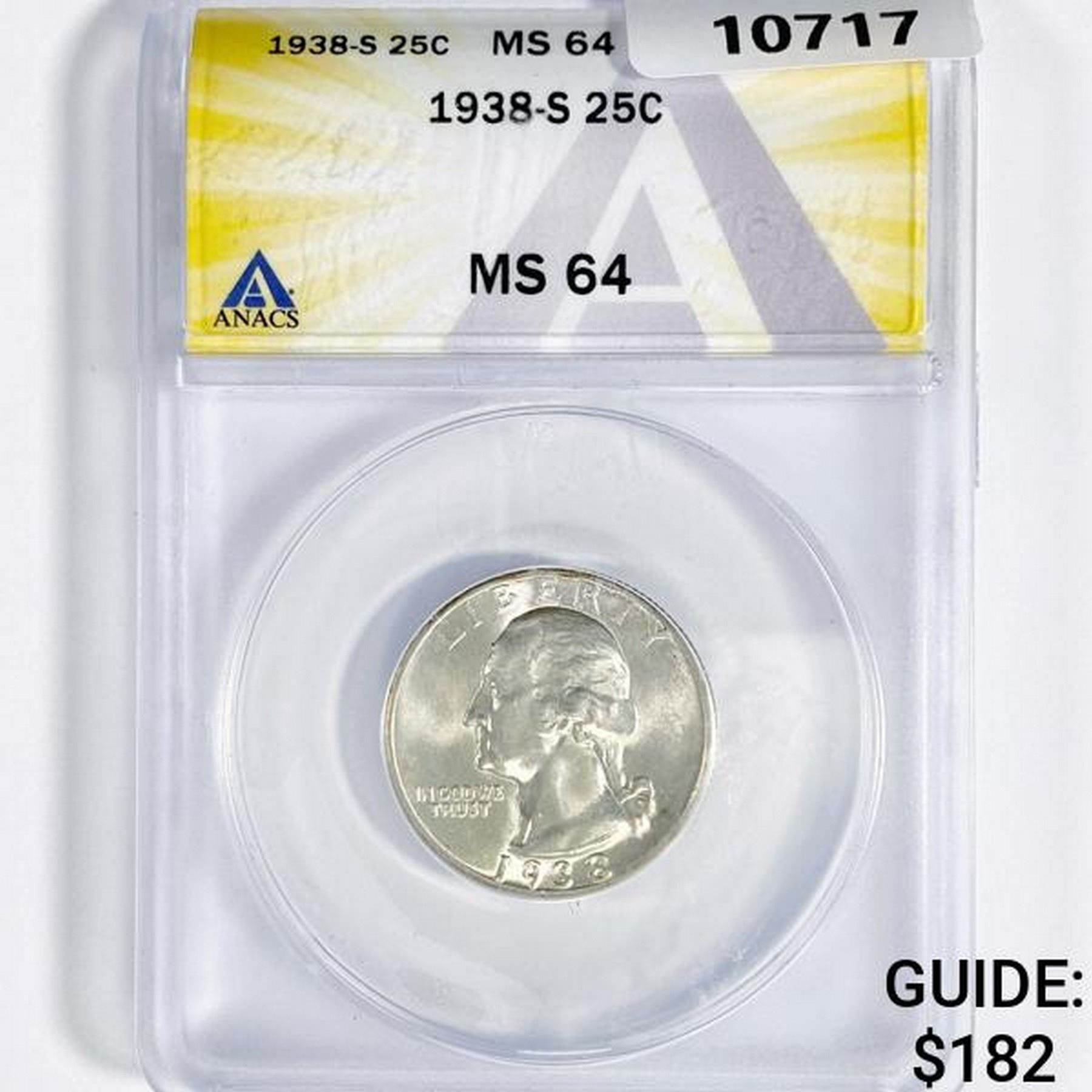 1938-S Washington Silver Quarter ANACS-MS64