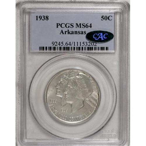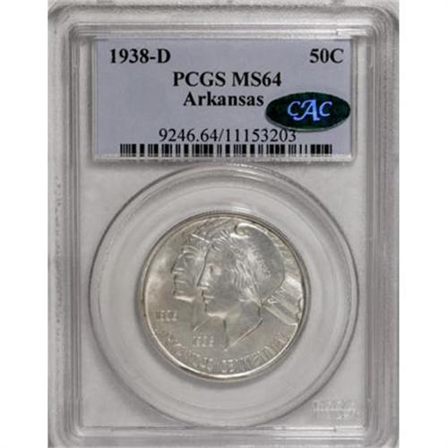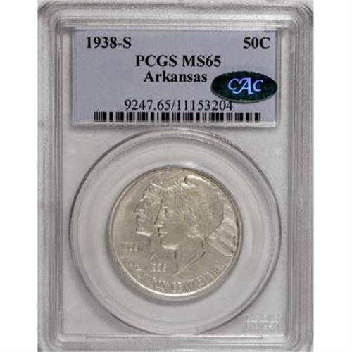 <B>1938 SET Arkansas PDS Set MS64 to MS65 PCGS. CAC.</B></I> The set includes: <B>1938 MS64,</B></I> faintly toned and satiny with a mark near the T in LIBERTY; <B>1938-D MS64,</B></I> untoned aside from a blush of mauve and sea-green along the lower left reverse border; and a <B>1938-S MS65,</B></I> unabraded and well struck with subdued chestnut-gray surfaces.<BR><I>From The Southwest Collection.</B></I><BR><BR><b>Shipping:</b> Coins & Currency (<a target="_blank" href="http://www.heritageauctions.com/common/shipping.php">view shipping information</a>)