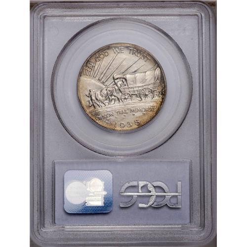 <B>1938<img border='0' src='http://www.heritagecoins.com/images/star.gif' width=10 height=10>ET> Oregon PDS Set MS65 to MS66 PCGS.</B></I> The set includes: <B>1938 MS66,</B></I> lustrous, well struck save for the back of the ox, lavish orange-tan and speckled russet patina; <B>1938-D MS65,</B></I> nearly immaculate, satin luster, a hint of striking softness on the back of the wagon, light speckled patina; and a <B>1938-S,</B></I> sharply struck, deep orange-tan and speckled russet color, outstanding overall quality. Includes a cardboard holder from The Oregon Trail Commemorative Association that probably held the coins for many years before their PCGS encapsulation.