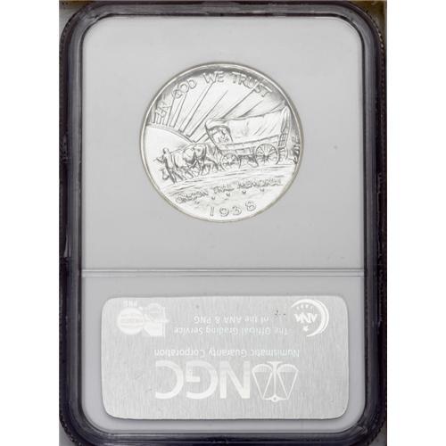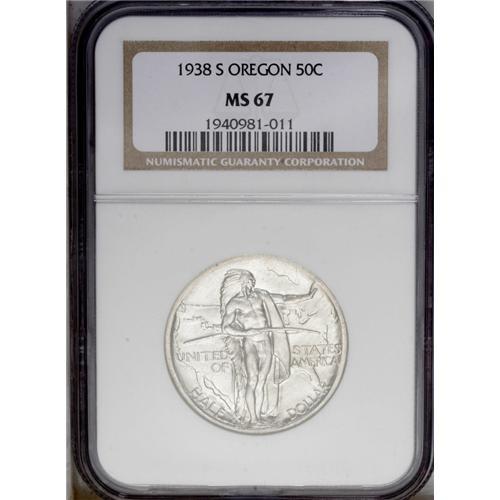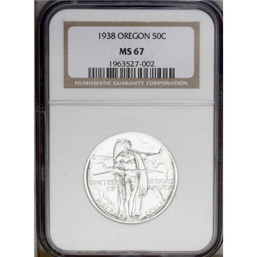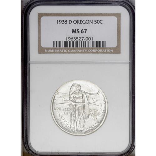 <B>1938<img border='0' src='http://www.heritagecoins.com/images/star.gif' width=10 height=10>ET> Oregon PDS Set MS67 NGC.</B></I> The set includes: <B>1938,</B></I> sharply struck and stone-white; <B>1938-D,</B></I> light tan toning, minor bluntness on the back of the wagon; and a <B>1938-S,</B></I> a well struck and exemplary chestnut-gray Superb Gem.