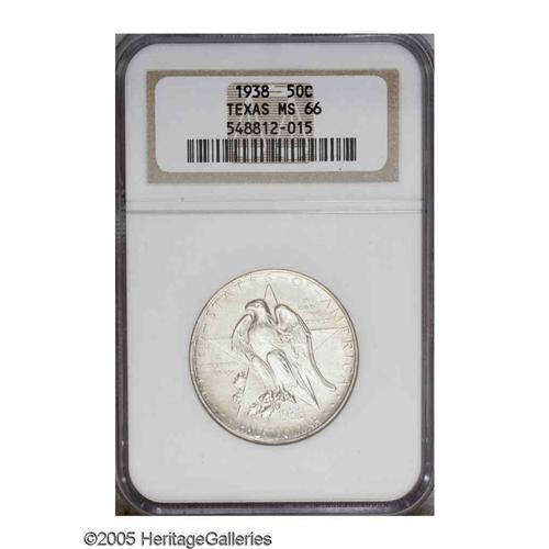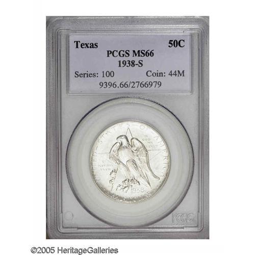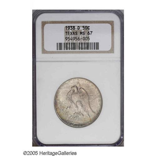 <B>1938<SET> Texas PDS Set.</B></I> The set includes: <B>1938 MS66 NGC,</B></I> a crisp strike, satiny, exceptional preservation, pastel blue and gold color; <B>1938-D MS67 NGC,</B></I> dappled rose, orange, lime, and lilac tints, well struck and close to pristine; and a <B>1938-S MS66 PCGS,</B></I> lustrous, nearly brilliant, unmarked and impressive. The lowest mintage set of the type.<BR><I>From The Clearfield Collection.</B></I>