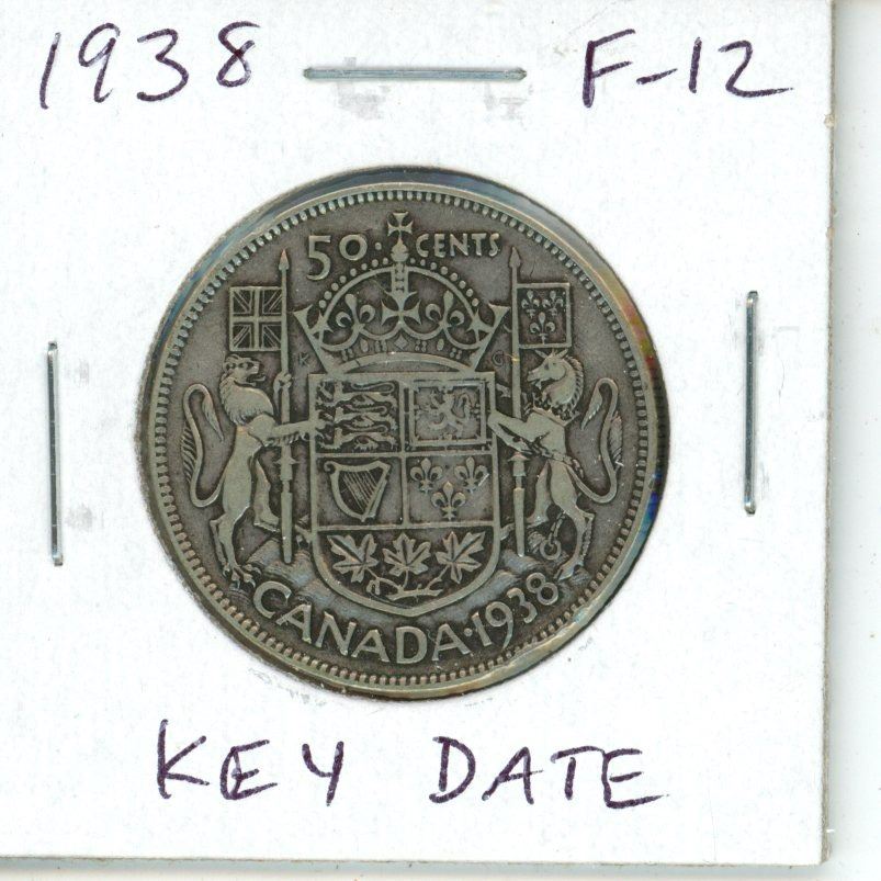 1938 Silver 50 Cents. Key Date. Mintage of 192,018. F-12.