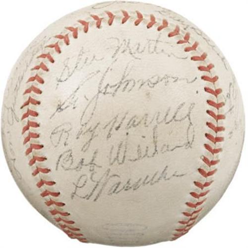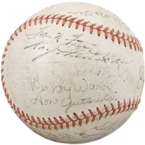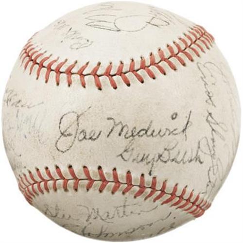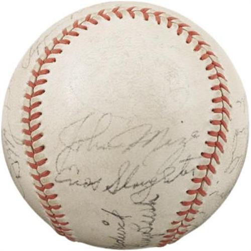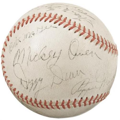 <B>1938 St. Louis Cardinals Team Signed Baseball.</B></I> Hall of Fame legend retired his Louisville Slugger at the end of the 1937 season to turn his attentions completely to his managerial duties, and while this 1938 squad didn't quite conquer the National League, he did keep fantastic company during his struggles. Joining The Flash upon this "Official League" ball are the autographs of seventeen others, including Dizzy Dean, Slaughter, Mize, Medwick, Pepper Martin, Bush, Wares, Gonzalez and Owen. Signature quality remains strong throughout, ranging from 6/10 to 9/10, and the ball has retained its innocent white shade admirably. <I>LOA from PSA/DNA. LOA from James Spence Authentication.</B></I><BR><BR><b>Shipping:</b> Balls, Pucks, etc., Small (<a target="_blank" href="http://www.heritageauctions.com/common/shipping.php">view shipping information</a>)