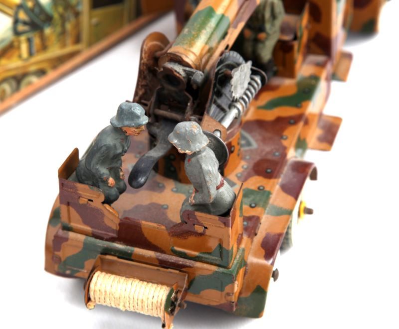 Very good condition with four soldiers, does not have winding key, 11 inches, tires are marked Dunlop Balloon Cord, then in tiny lettering marked foreign.