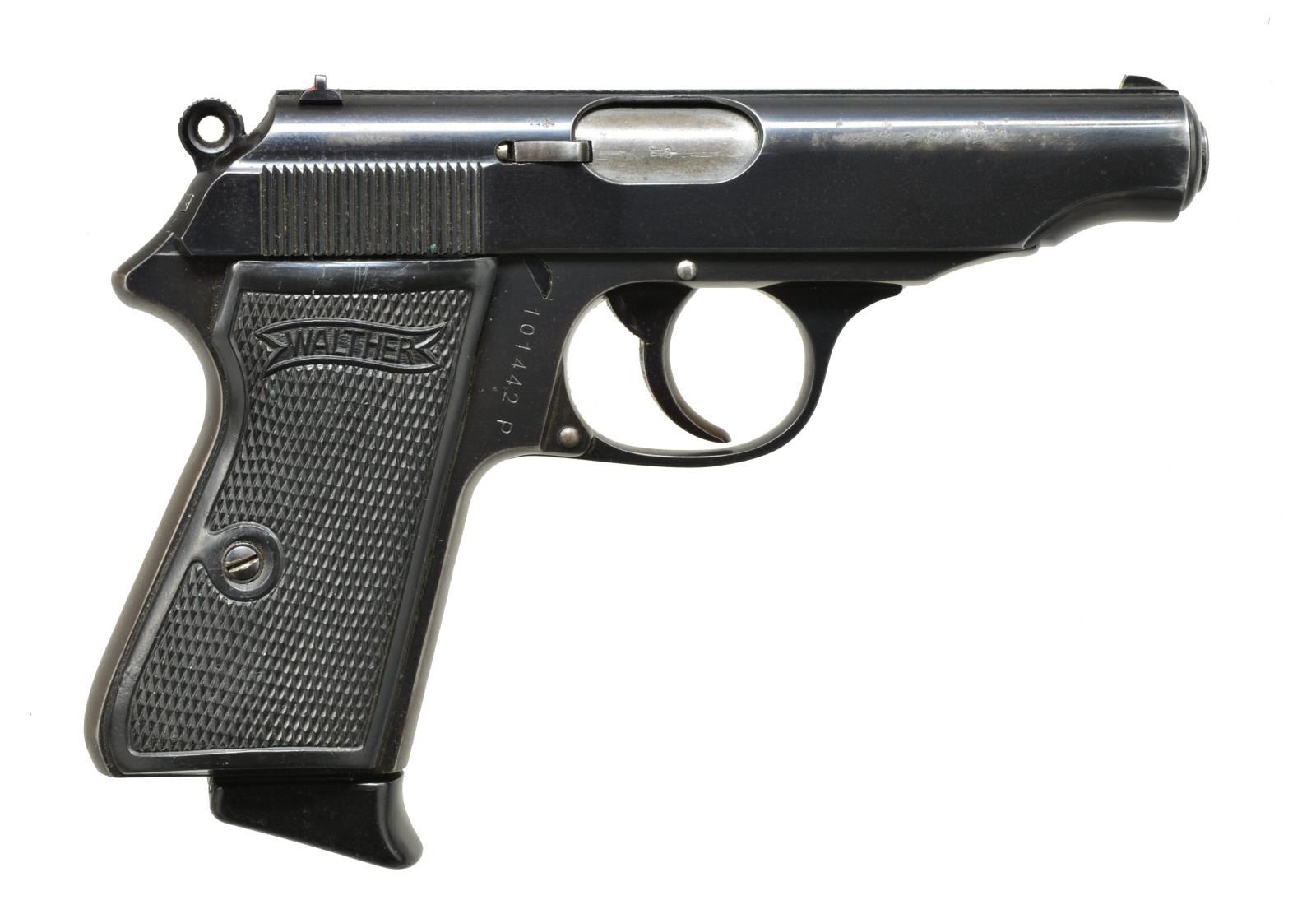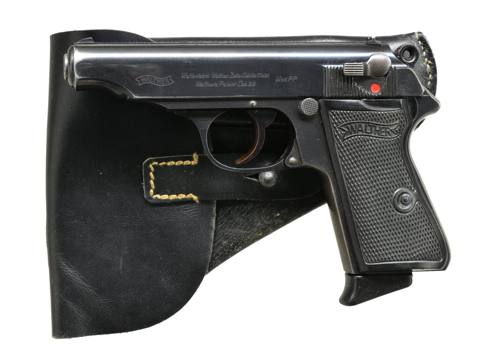 Cal. .22 LR. S# 101442P. Usual configuration w/ specially machined light weight slide. Crown “N” proof on bbl. & on slide behind ejection port. Black hard rubber grips. Mag. w/ black bakelite extension. UNATTACHED ACCESSORIES: spare .22 mag. w/ steel base & reproduction black leather holster. CONDITION: action & frame retaining approx. 90% original blue w/ considerable holster & edge wear on slide. Frame straps turning to brown. Bright, shiny bore. There is red paint under aperture on rear sight. Grips are very fine w/ no chips. (20-3217/MGM). CURIO. $1,200-1,800.