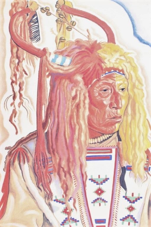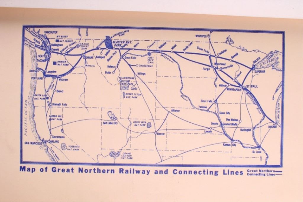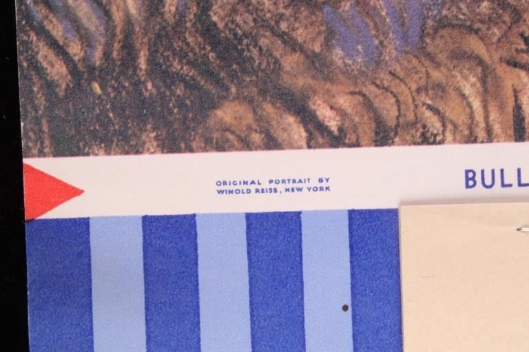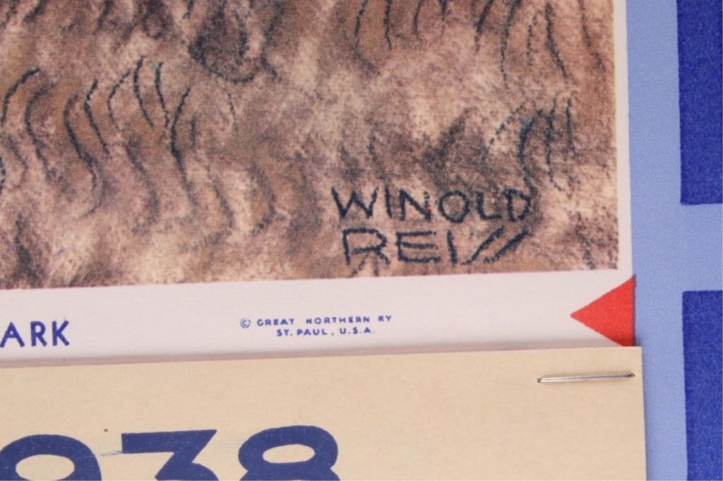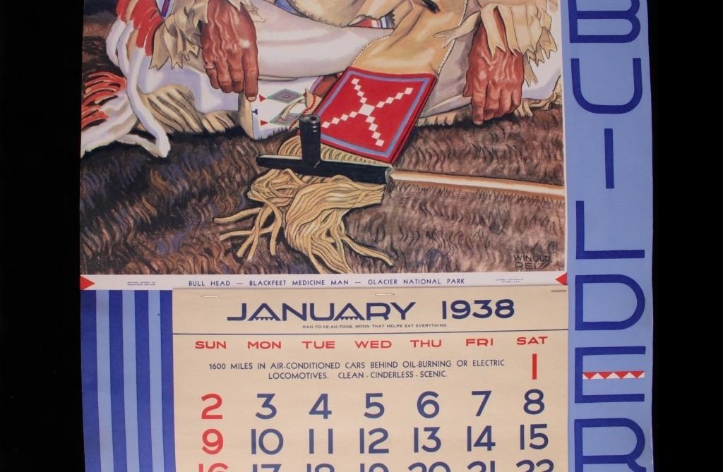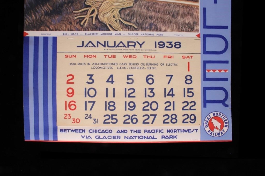 Featured in this lot is this original 1938 calendar from the Great Northern Railway. The calendar features the artwork of Winold Reiss, who is well known for his artwork of the Blackfeet Indians. This piece shows Blackfeet Indian Medicine Man, "Bull Head", from Glacier National Park. The calendar shows good condition and appears to be complete with all 12 months. The calendar measures 32 3/4" x 16".