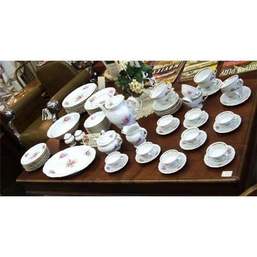 This is a very pretty set of 1938 Wawel China made in Poland. It is a service for eight with serving pieces. A total of 73 pieces. All the pieces have a raised embossed design around the edge and multicolored floral sprays with the large flower being a beautiful rose. It consists of 8 dinner plates. 8 salad/cereal/soup bowls. 8 dessert bowls. 8 dessert or bread and butter plates, vegetable bowl, salt and pepper, creamer, covered sugar, teapot with lid, 8 demi cups and 8 saucers, 8 coffee cups and 8 saucers, and a platter. I checked with Replacements, Ltd. and their price for these pieces would be $1,036.42 plus shipping and insurance.