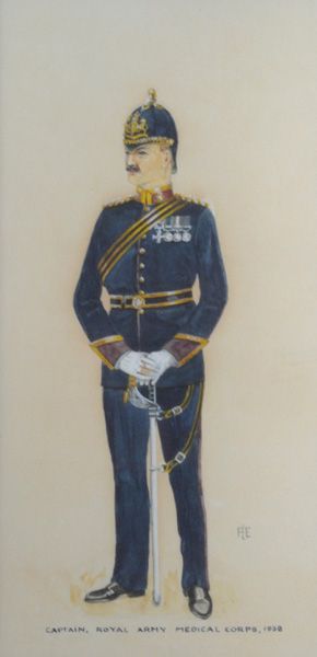 Watercolour showing the uniform of a Captain in the Royal Army Medical Corps and dated 1938. In contemporary frame by William Rodman of Belfast. Signed with monogram FEE lower right.