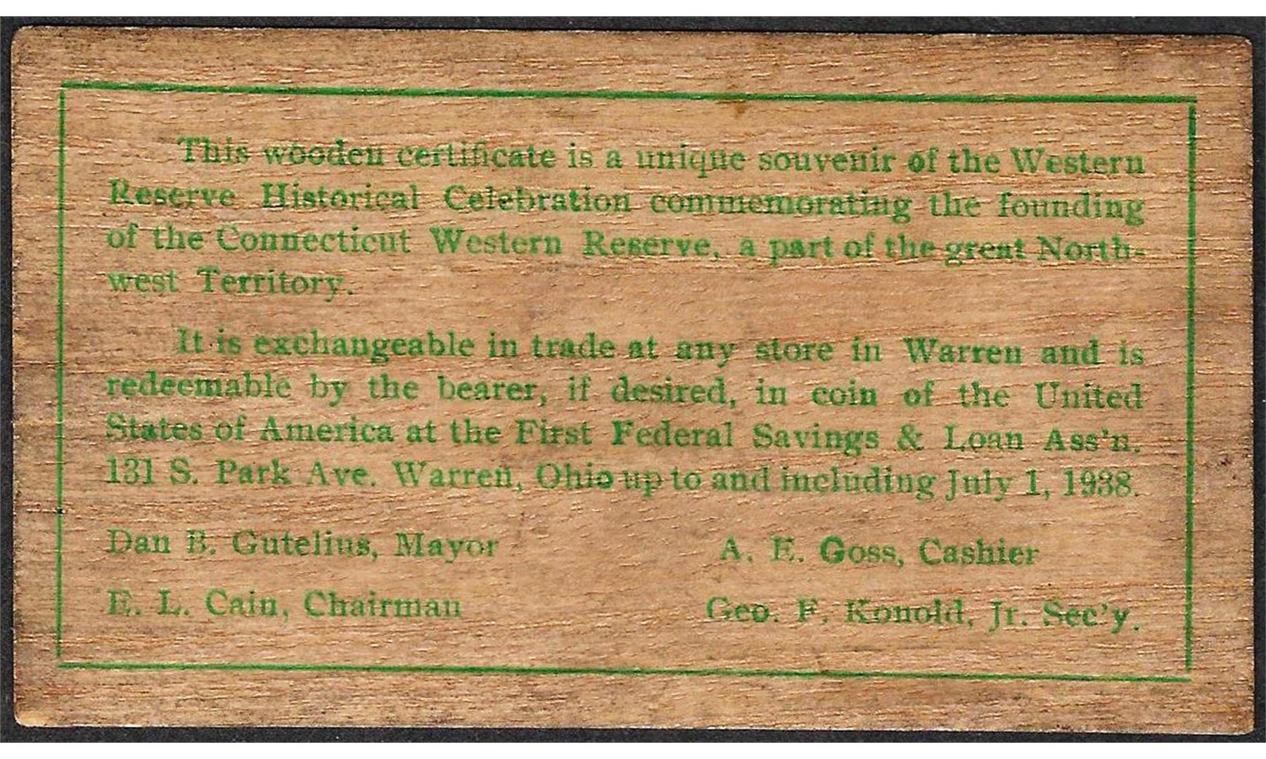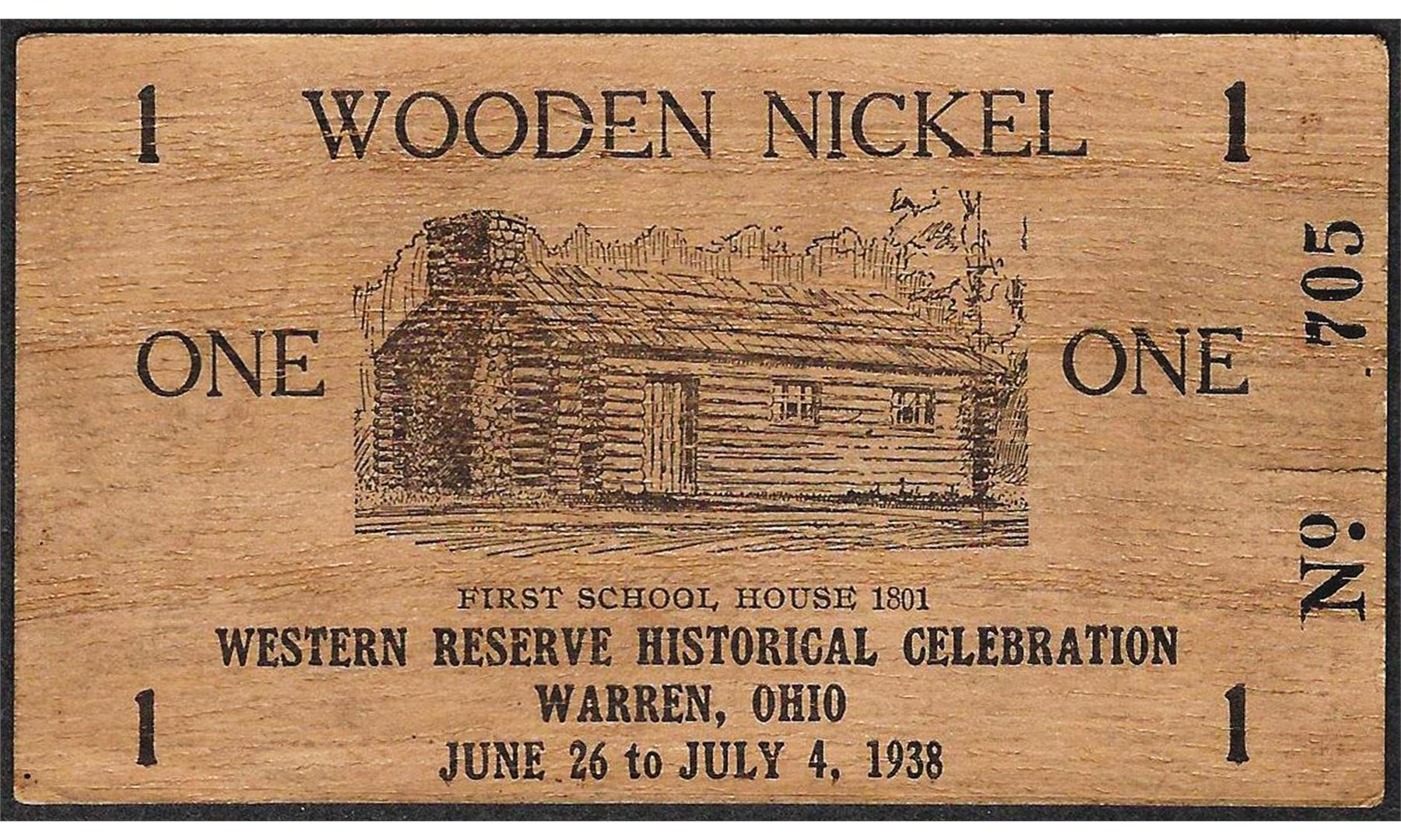 One 1938 Western Reserve Historical Celebration Warren, OH Wooden Nickel.