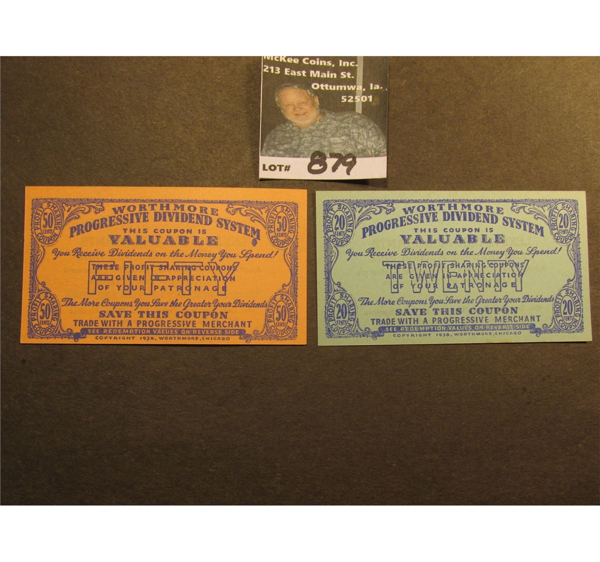 1938 "Worthmore Progressive Dividend System" 20 & 50 Value Coupons from Lexington (Illinois) Merchants during the depression. Both CU.