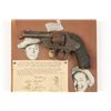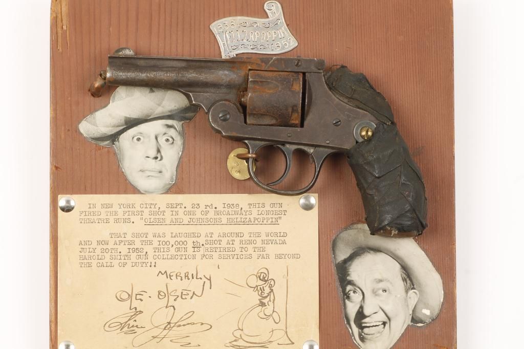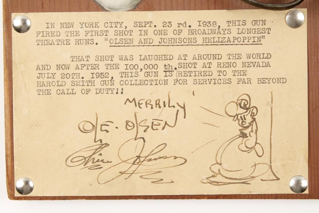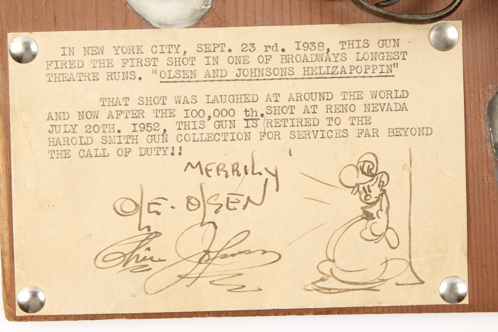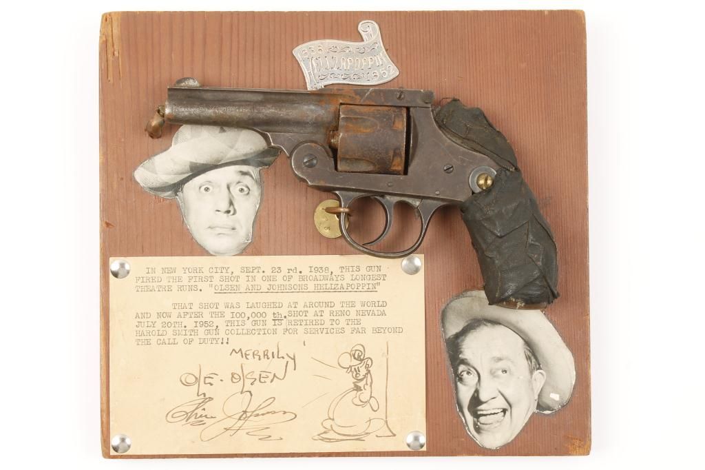 1938 commemorated Broadway show “Hellzapoppin” with this .38 caliber double action H&R pistol, mounted on display plaque, serial number 666089 was a prop in that play and fired 100,000 shots. The revolver wasplaced in the Harold’s Club Collection in Reno, Nevada on July 20, 1952 and a card signed by stars Ole Olson and Chick Johnson is affixed to the plaque with an engraved plaque 1938 Hellzapoppin”. Also by collectors tradition this pistol was used in a Groucho Marx movie of the same name. From the Harold’s Club Collection with their inventory tag attached number 723 as sold by Butterfields and Butterfields of SanFrancisco where it was listed in their catalog of the auction. Est.: $750-$1,500.