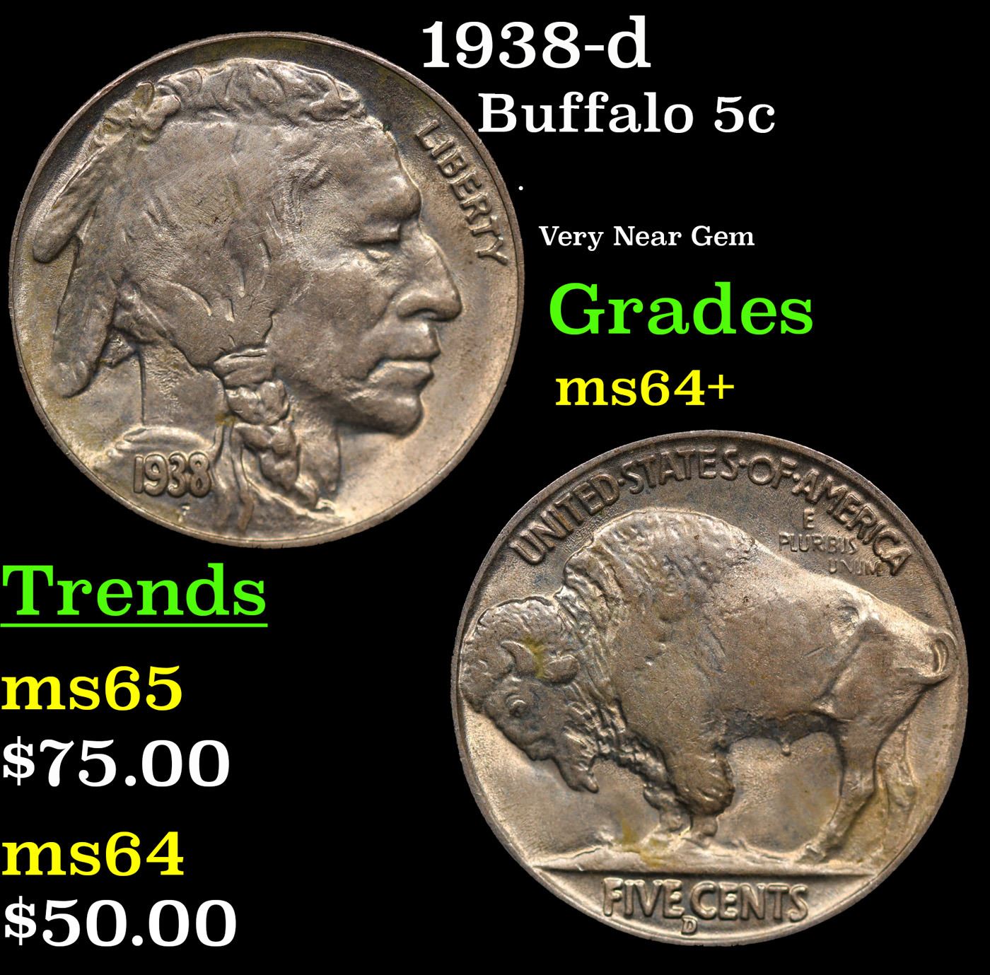 1938-d Buffalo Nickel 5c Grades Choice+ Unc.
