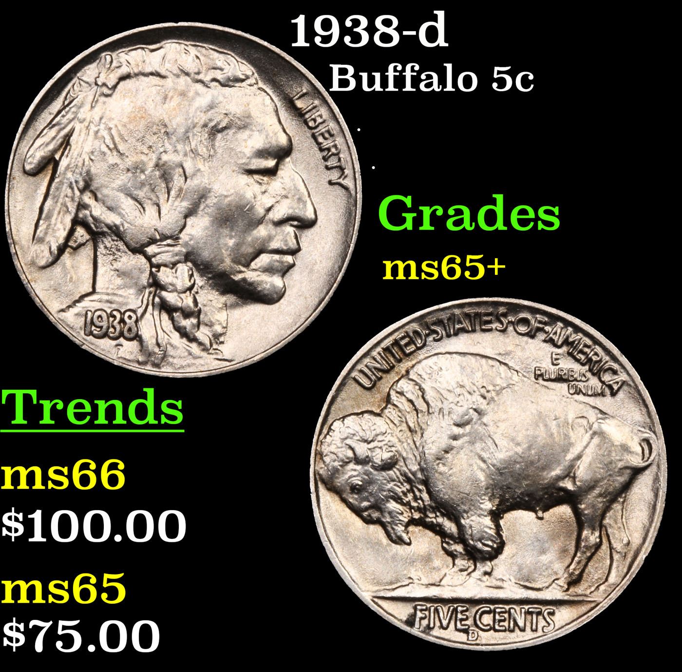 1938-d Buffalo Nickel 5c Grades GEM+ Unc.