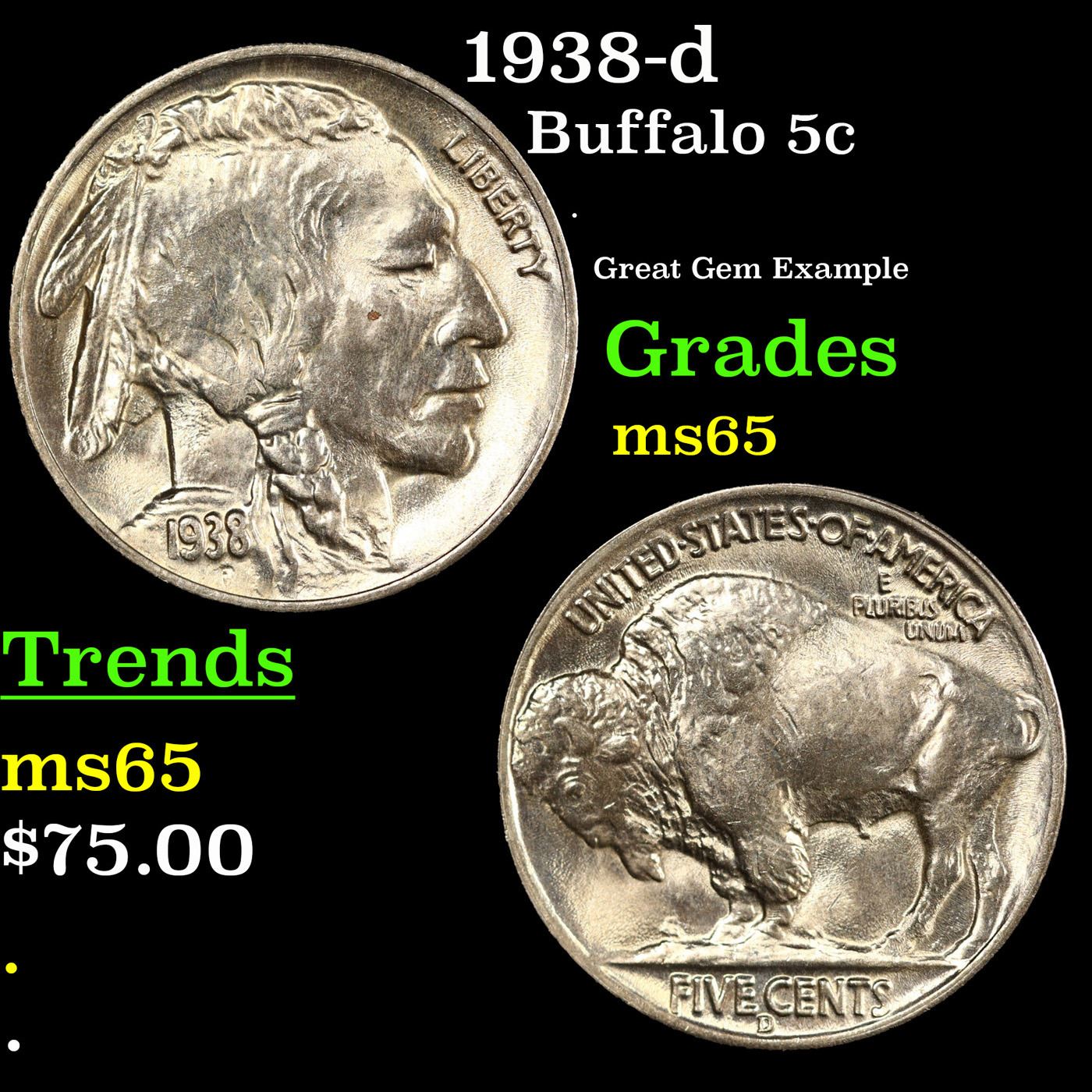 1938-d Buffalo Nickel 5c Grades GEM Unc.