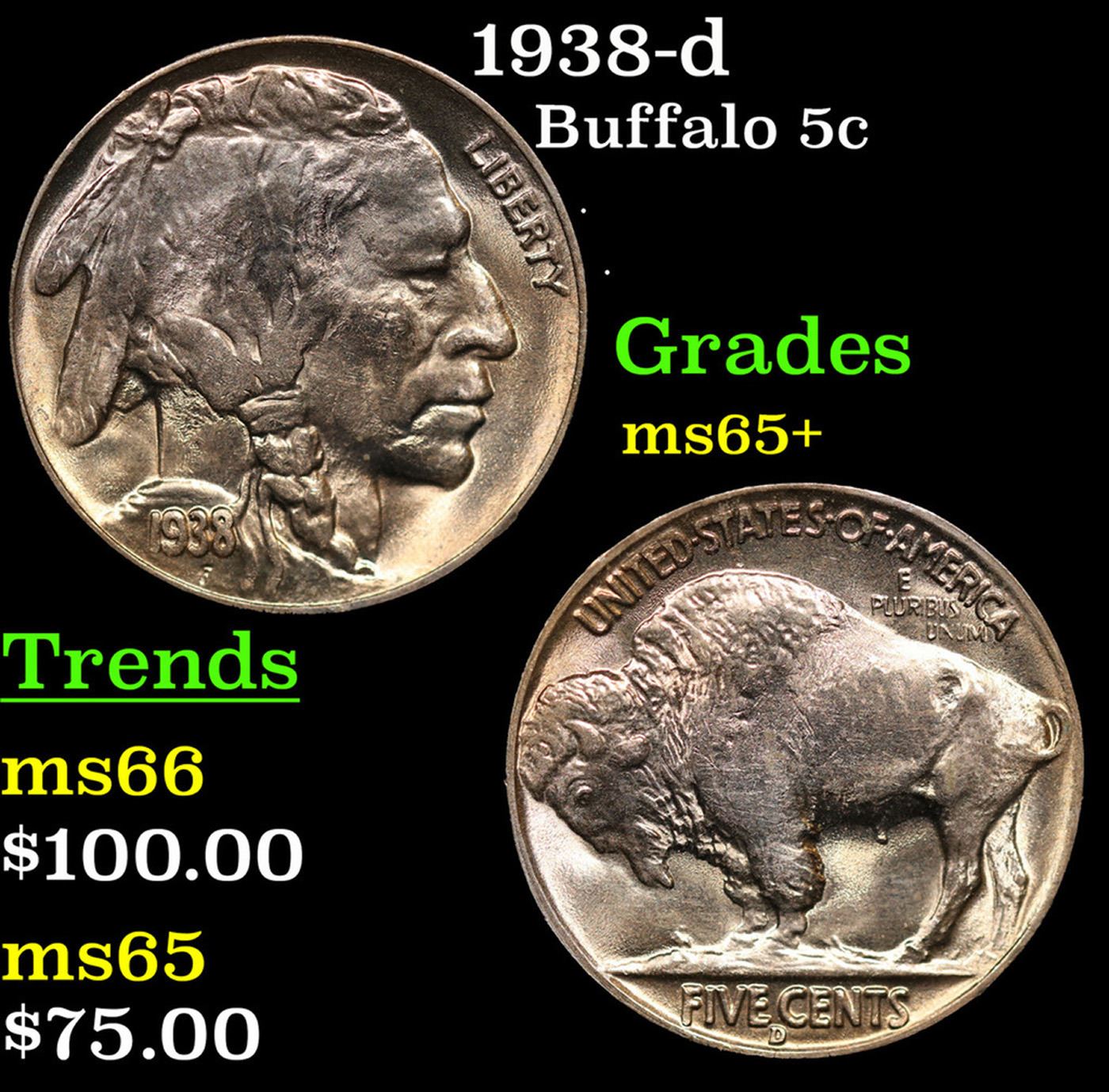 1938-d Buffalo Nickel 5c Grades GEM+ Unc.