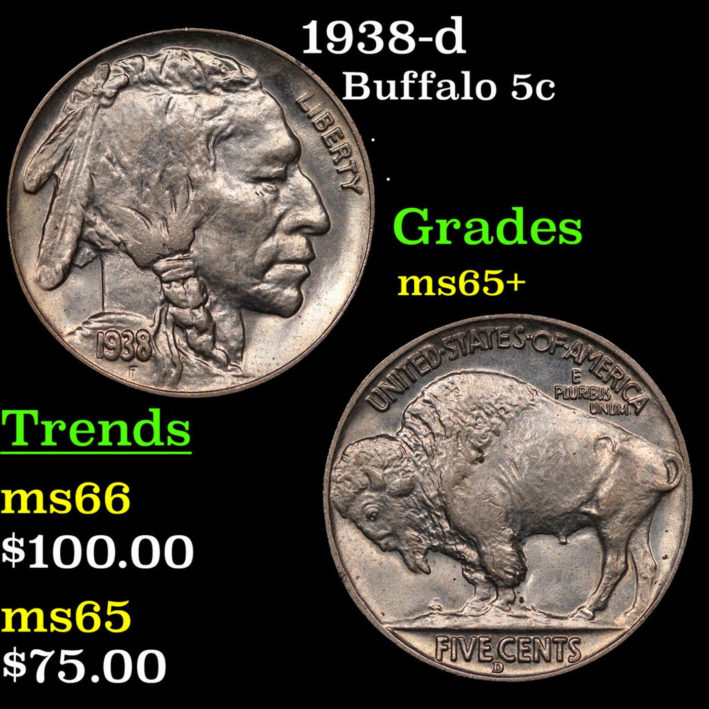 1938-d Buffalo Nickel 5c Grades GEM+ Unc.