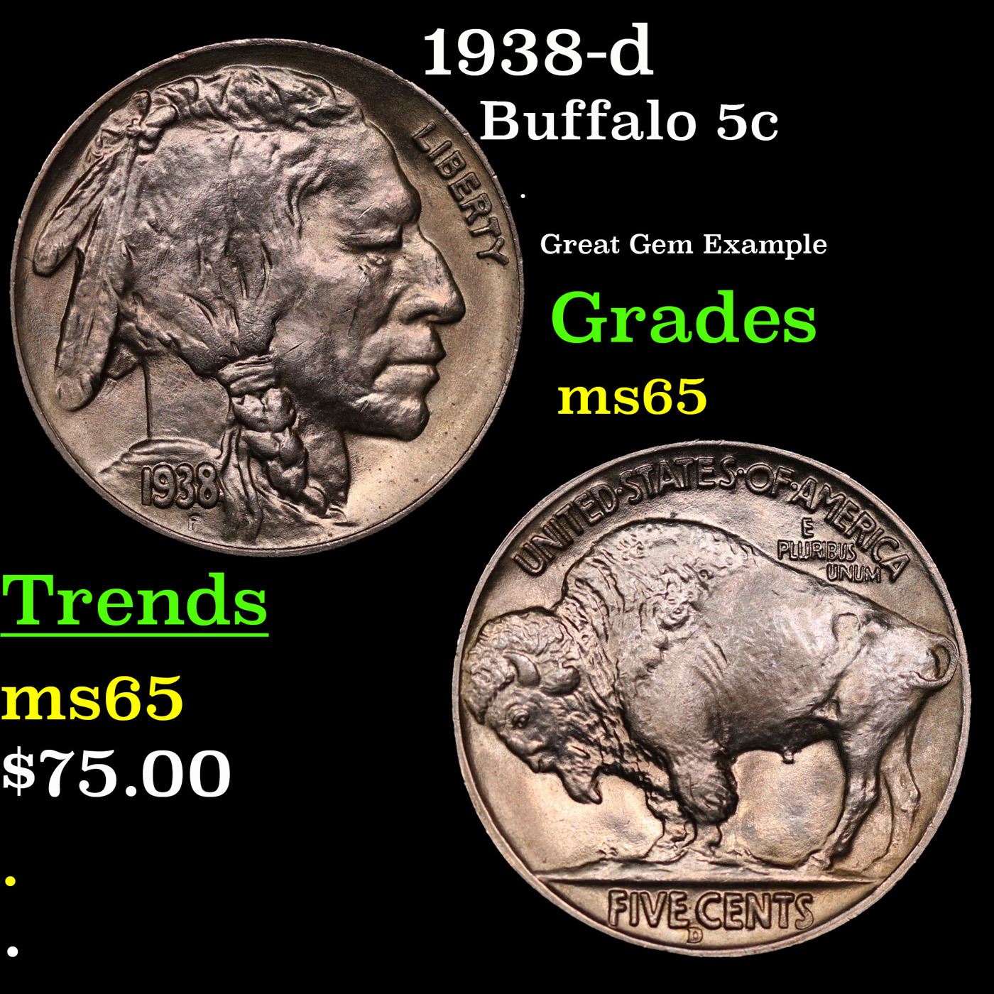 1938-d Buffalo Nickel 5c Grades GEM Unc.