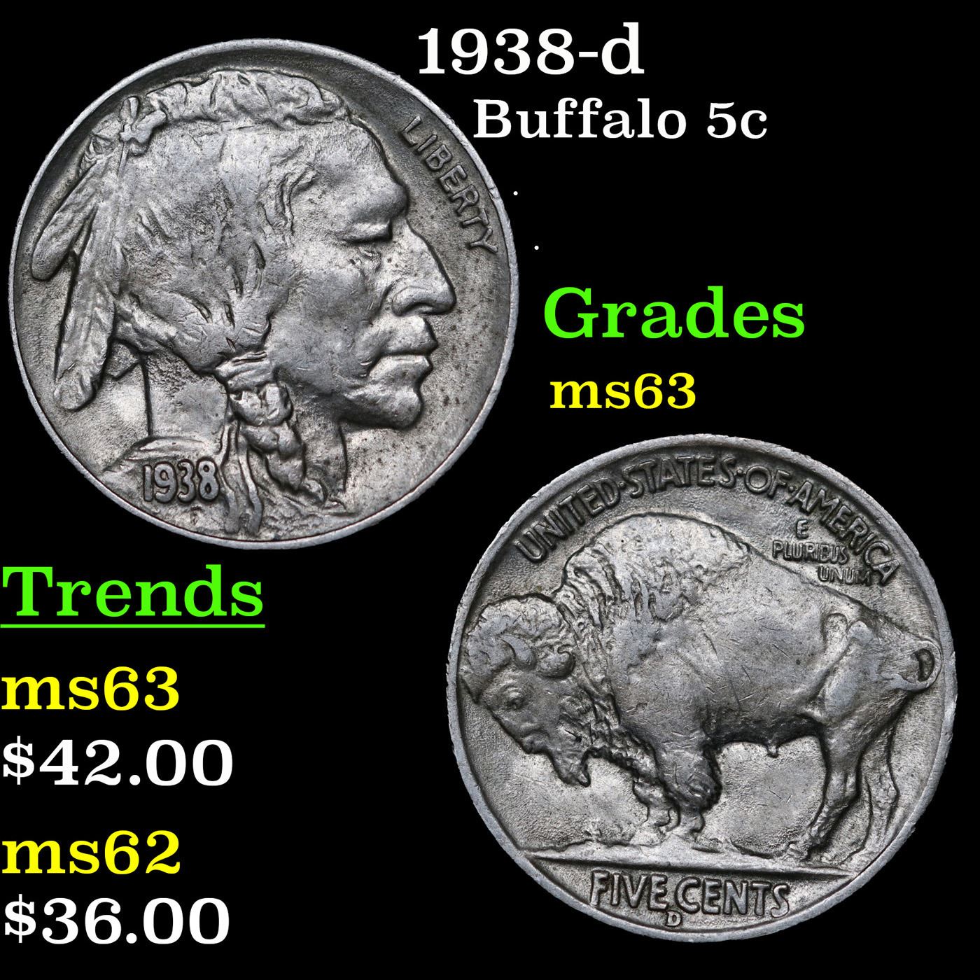 1938-d Buffalo Nickel 5c Grades Select Unc.