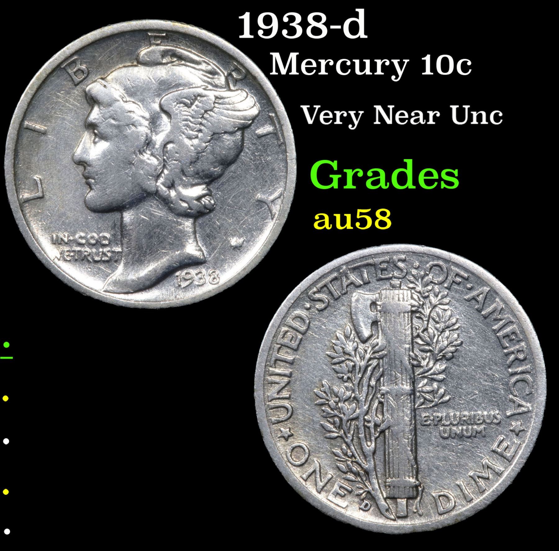 1938-d . Very Near Unc Mercury Dime 10c Grades Choice AU/BU Slider.