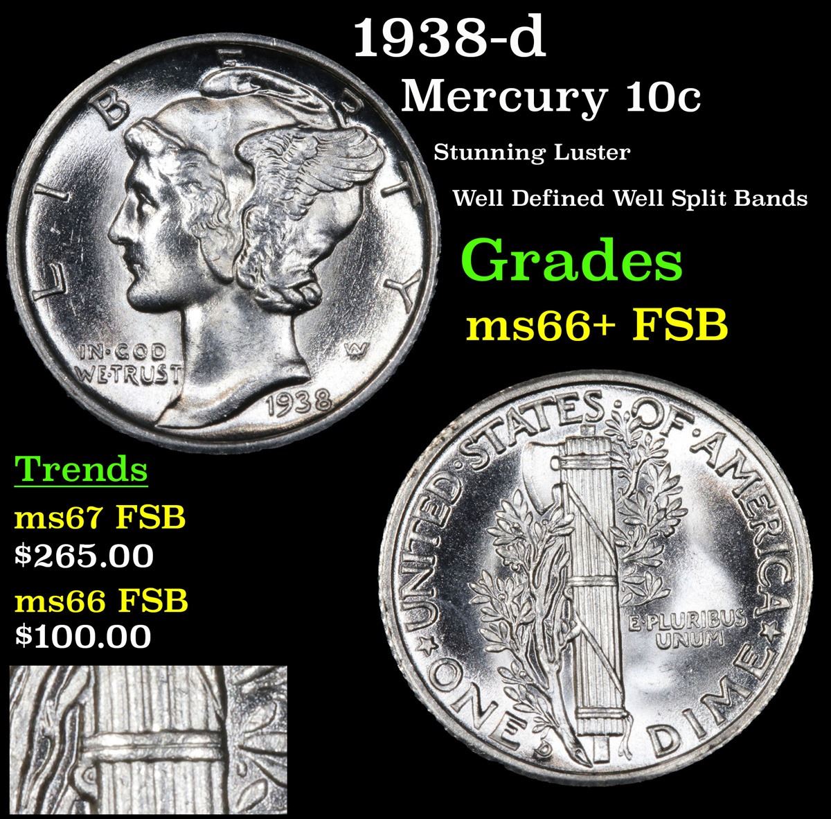 1938-d Stunning Luster Well Defined Well Split Bands Mercury Dime 10c Grades GEM++ FSB.