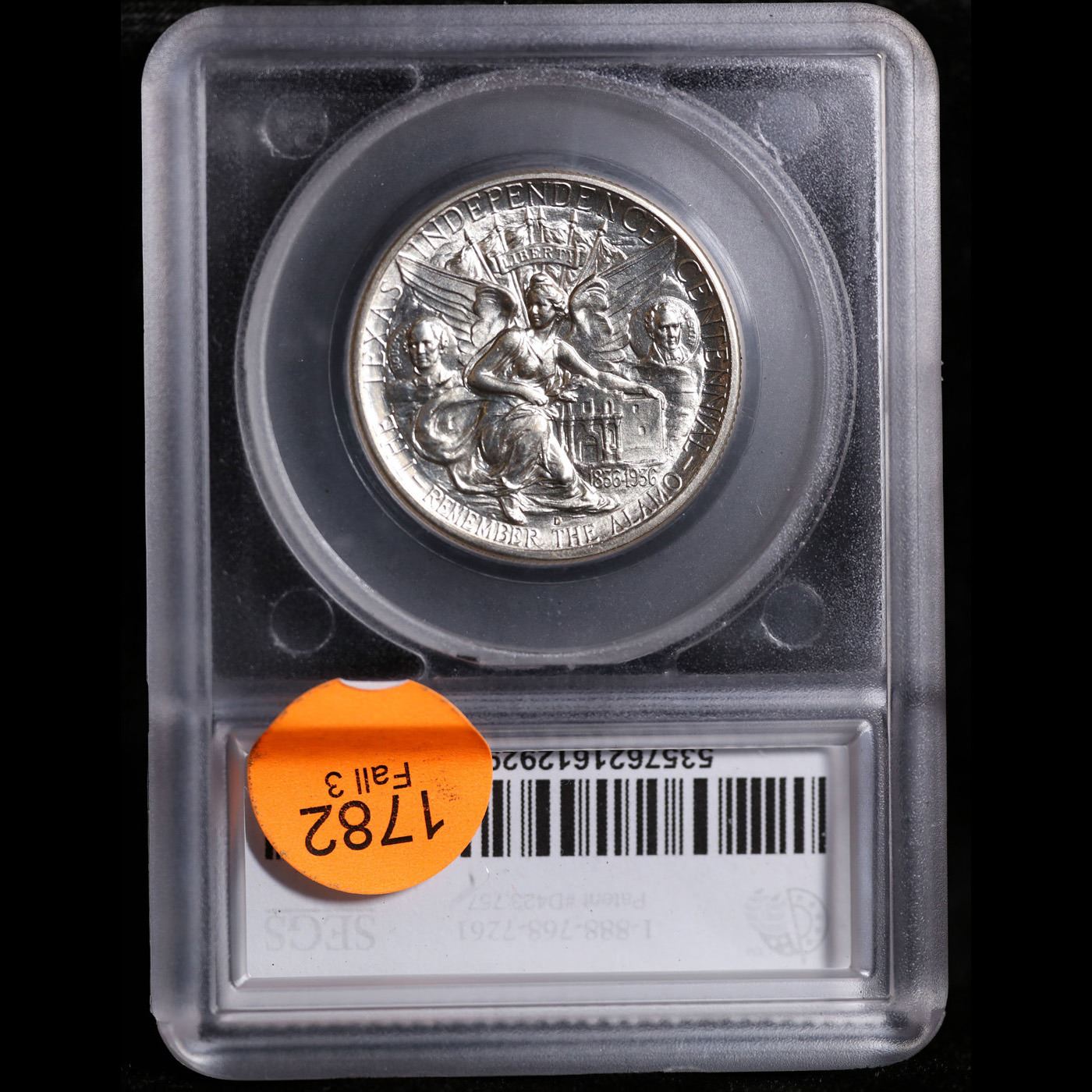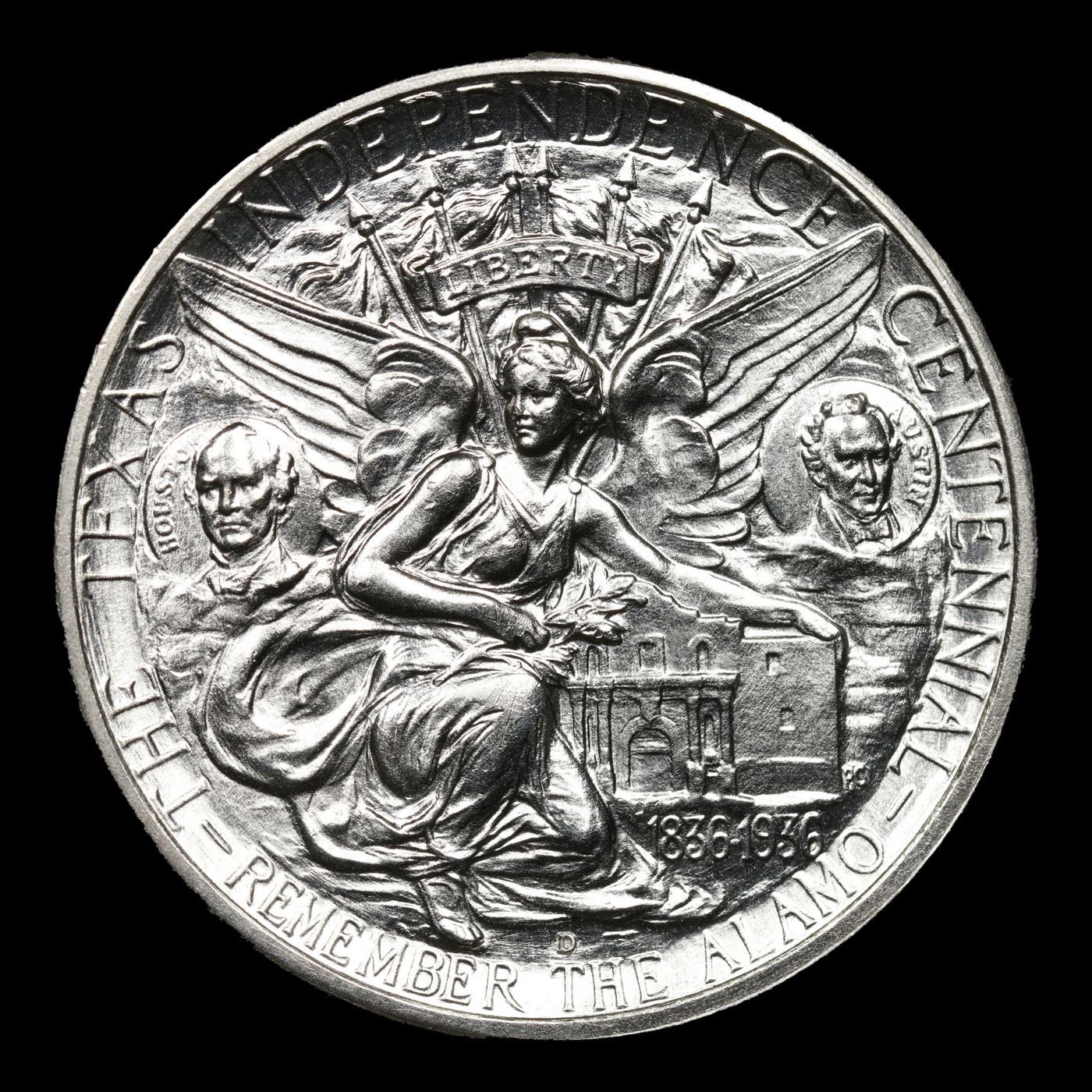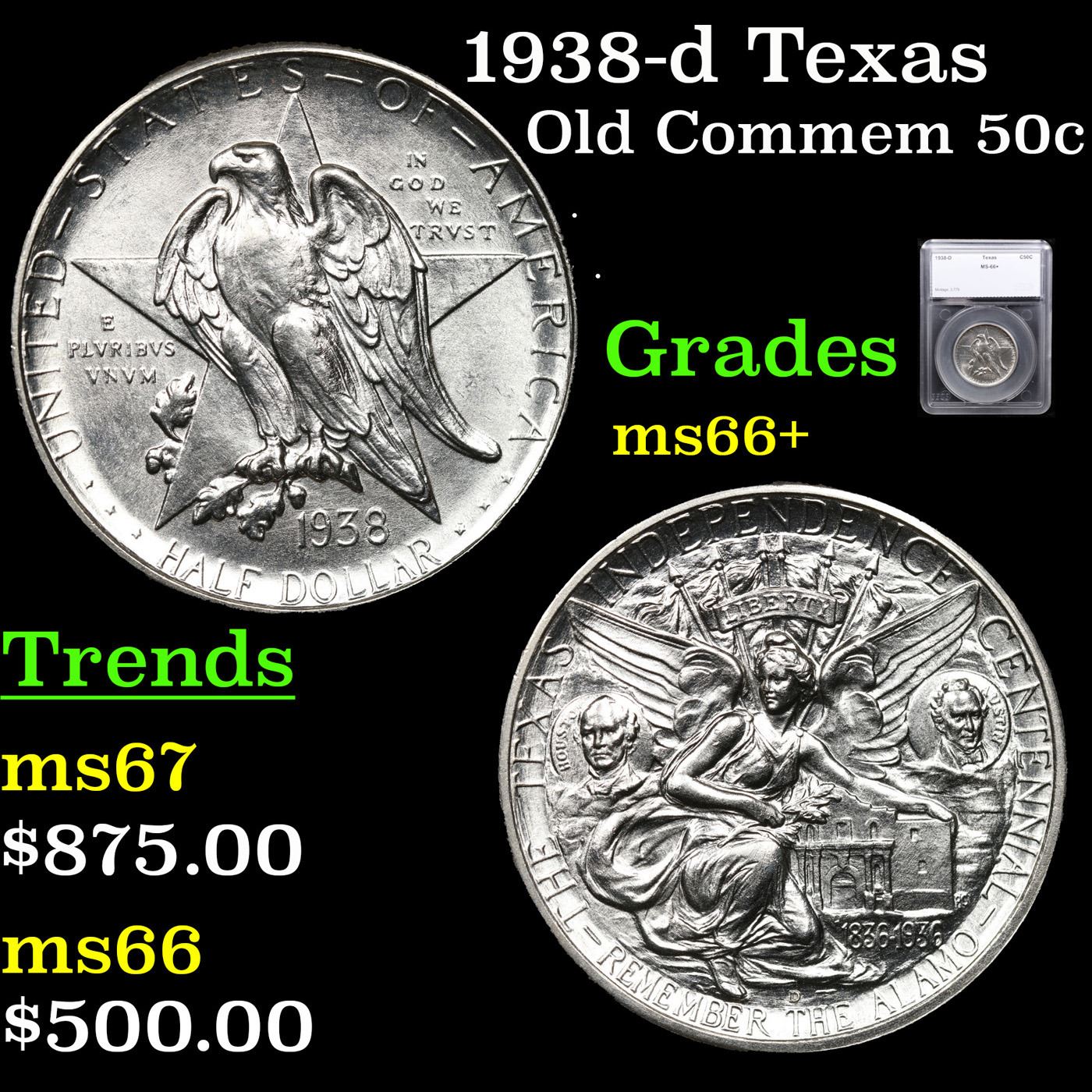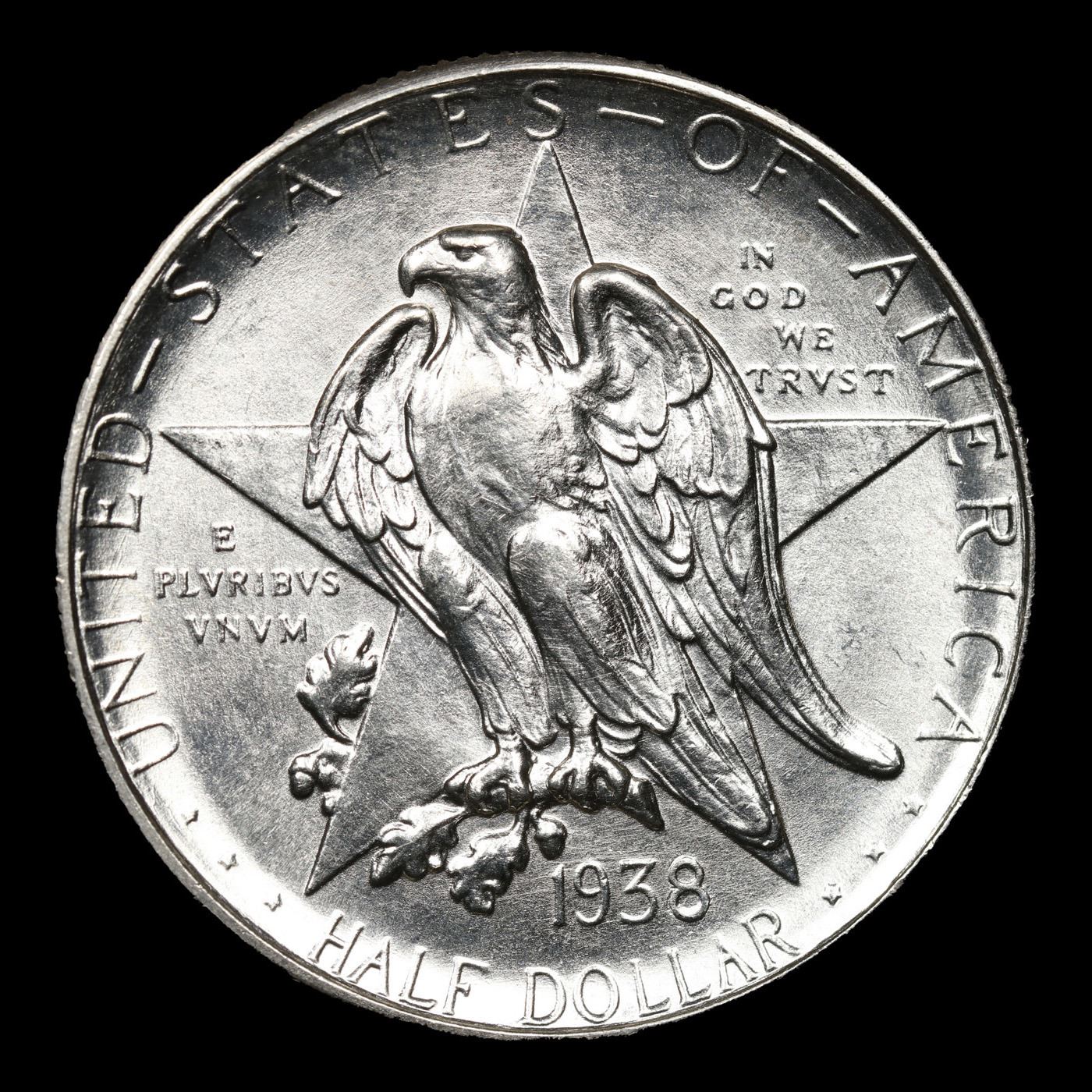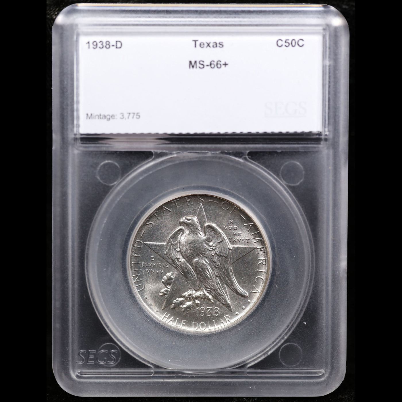 1938-d Texas Old Commem Half Dollar 50c Graded ms66+ By SEGS. The Texas Centennial half dollar commemorative coin was minted to honor the Centennial of Texas's independence from Mexico. Early in the administration of President Franklin Delano Roosevelt, on June 15, 1933, Congress passed an act to authorize the coinage of silver half dollars "in commemoration of the one hundredth anniversary in 1936 of the independence of Texas, and of the noble and heroic sacrifices of her pioneers, whose revered memory has been an inspiration to her sons and daughters during the past century." The Texas commemorative series ran from 1934 thru 1938 and 13 different dates and mint mark combinations were issued. For each of the years 1935 thru 1938, coins were struck at all three Mints; Philadelphia, Denver, and San Francisco. But for the 1934 Texas, only Philadelphia Mint coins were issued. The original issue price was $1.00 per coin.The coin was designed by Pompeo Coppini, a Texan. The obverse depicts an Eagle sitting on a branch in front of the Lone Star, the symbol of Texas. The reverse depicts the goddess Victory spreading her wings over the Alamo. It also depicts Sam Houston on her left and Stephen F. Austin on her right. The Six Flags of Texas fly above her head. Under her it reads REMEMBER THE ALAMO. Over Sam Houston, Victory, and Stephen F. Austin it reads THE TEXAS INDEPENDENCE CENTENNIAL. A Corey's Pick, Bid to Win Coin