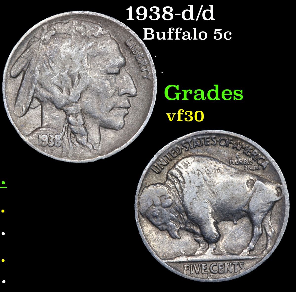 1938-d/d Buffalo Nickel 5c Grades vf++.