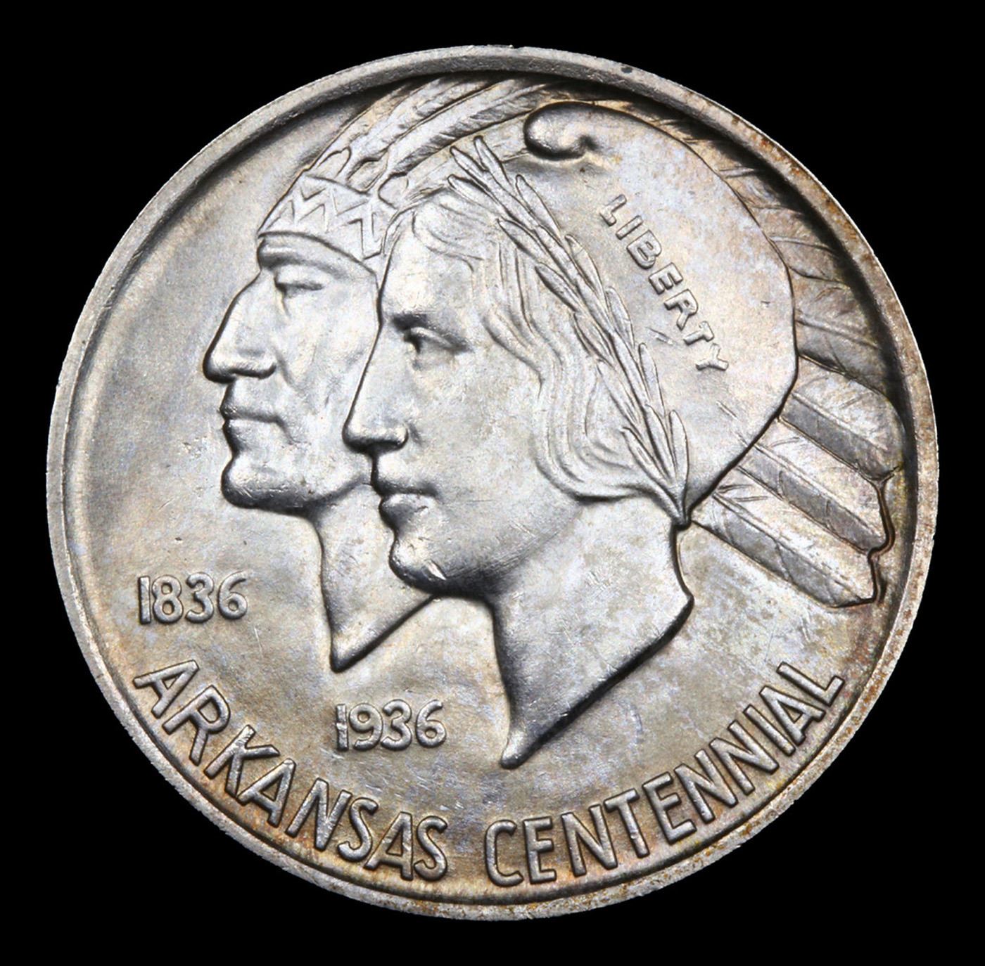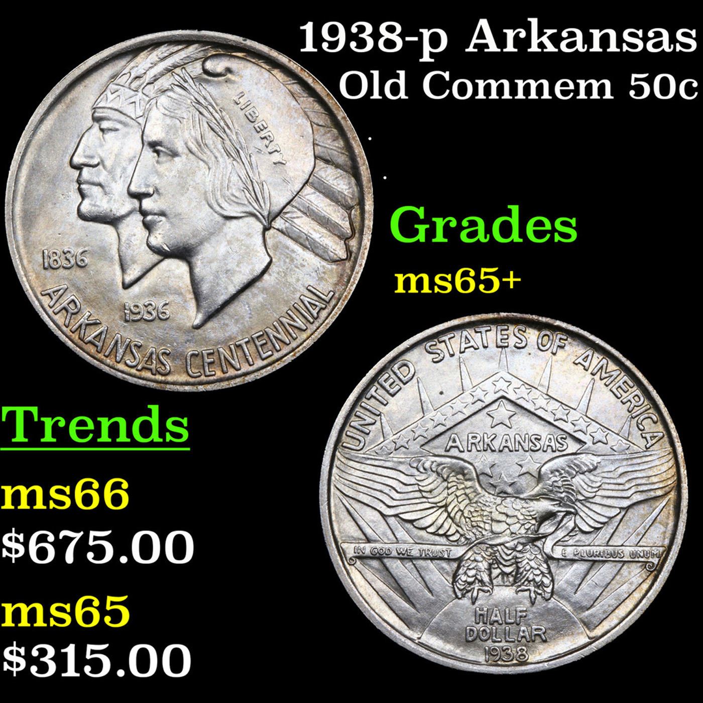 1938-p Arkansas Old Commem Half Dollar 50c Grades GEM+ Unc. Commemorative coins were authorized to celebrate the 100th anniversary of the admission of Arkansas into the Union. The Arkansas Centennial Half Dollars ended up being issued during five separate years, across three different mints. The coins became controversial due to the stream of variations created specifically to market to collectors, as well as the escalating issue prices as mintage for later issues became smaller.The obverse design features the head of Liberty and a Native American in headdress. Although this is now considered to be the obverse of the coin, there was initially some confusion and US Mint records and some references refer to this side as the reverse. In 1936, a new design was issued for this side of the coin, featuring a Senator who was living at the time of issue. The 1936 Robinson-Arkansas Half Dollar is considered a separate issue by most collectors.The reverse of the coin features the image of an eagle with wings spread, perched on the rising sun with rays emanating upwards. In the background a geometrical shape appears with the word “Arkansas” at center, amidst an arrangement of stars. Both the obverse and reverse design designed by Edward Everett Burr, following models prepared by Emily Bates.At the onset, the Arkansas Half Dollar was struck in a modest quantity of 13,012 pieces at the Philadelphia Mint with an additional 5,505 from Denver and 5,506 from San Francisco. The Philadelphia issues were sold at an issue price of $1 each, while the mint marked coins were purchased in a bulk transaction by a coin dealer and subsequently sold for $2.75 each. This initial situation was a taste of things to come.In the following year, coins from three different mints were initially offered for $1 each, but the price was quickly raised to $1.50 per coin, and eventually sold as sets of three coins for $6.75. The following year three coin sets were sold at $8.75, which was eventually raised to $10. This would also be the price of the 1939 sets.