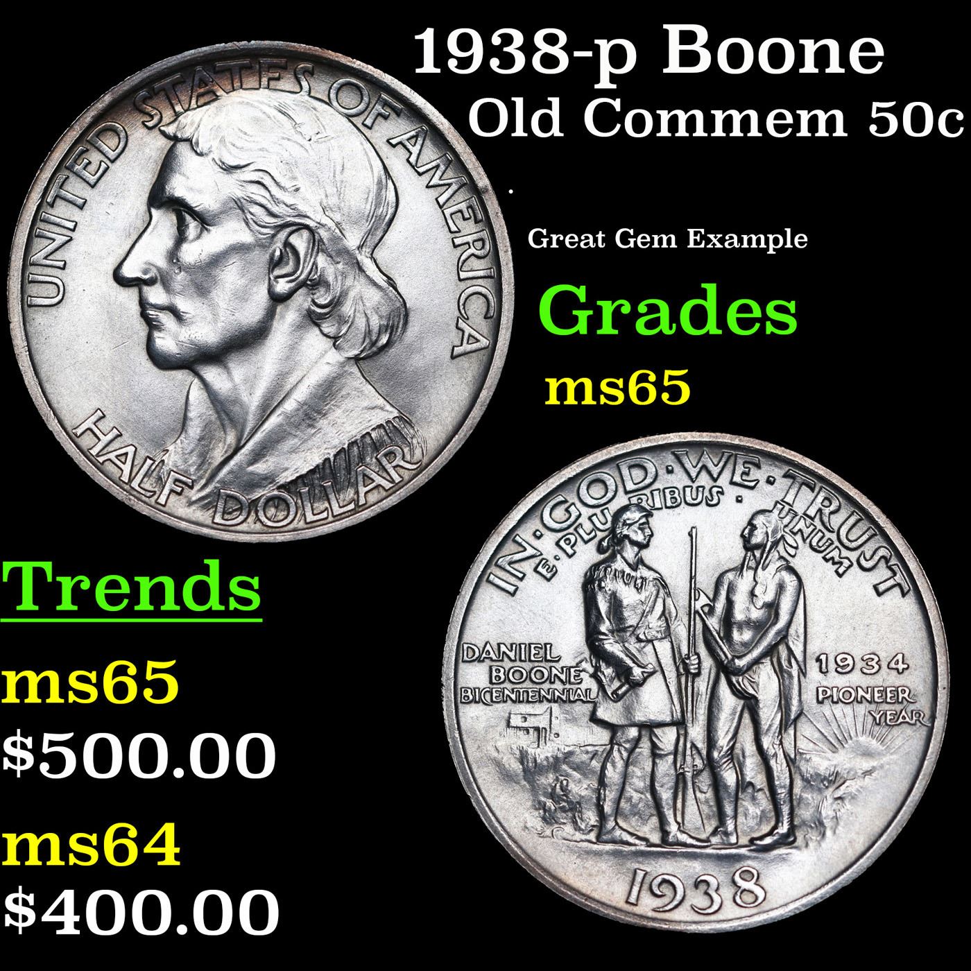 1938-p Boone Old Commem Half Dollar 50c Grades GEM Unc.