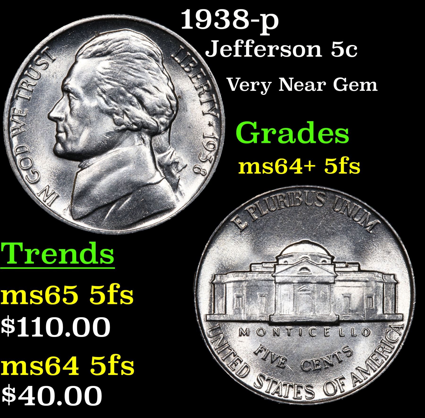1938-p . Very Near Gem Jefferson Nickel 5c Grades Choice Unc+ 5fs.