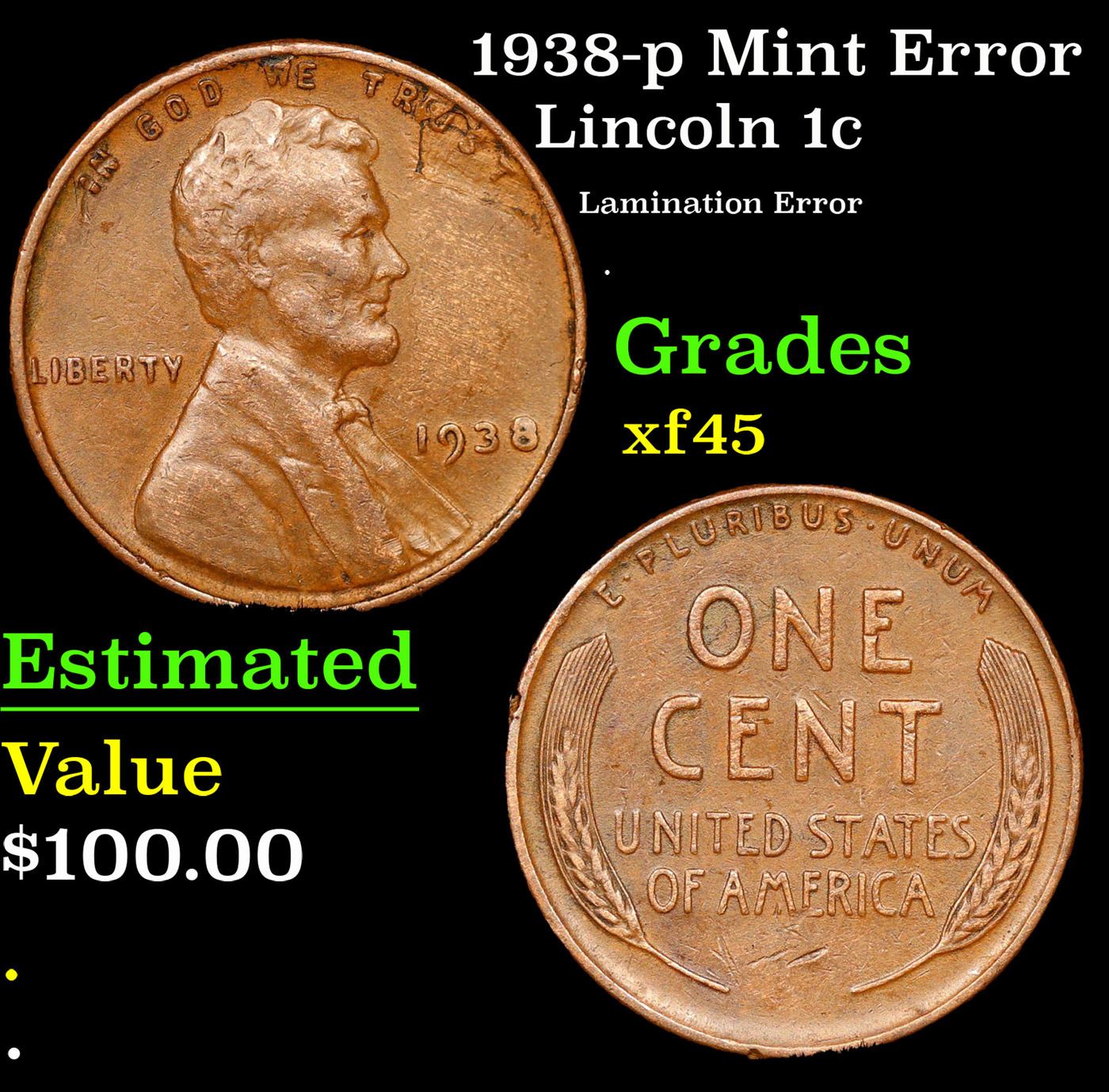 1938-p Mint Error Lincoln Cent 1c Grades xf+.