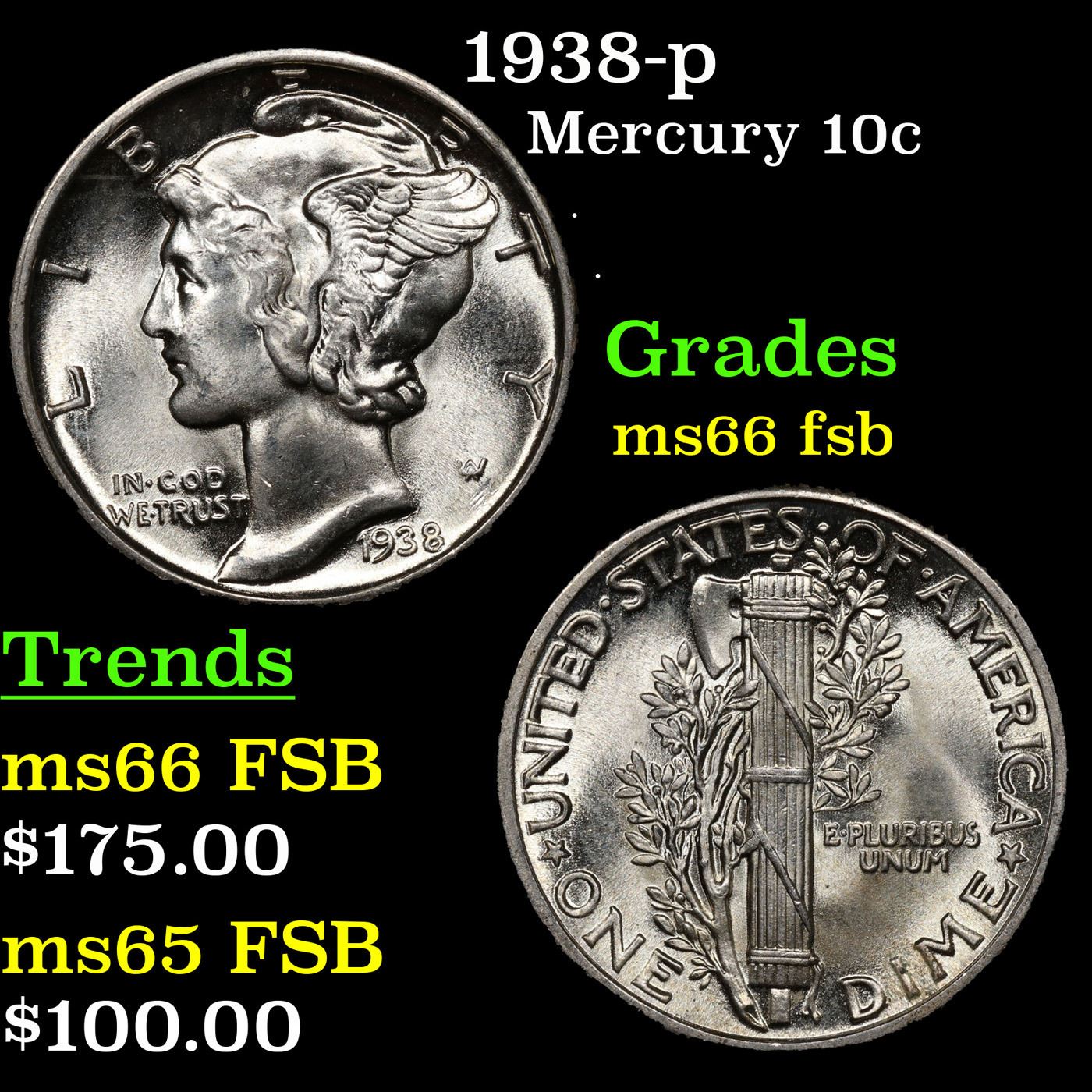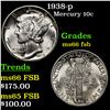 1938-p Mercury Dime 10c Grades GEM+ FSB.