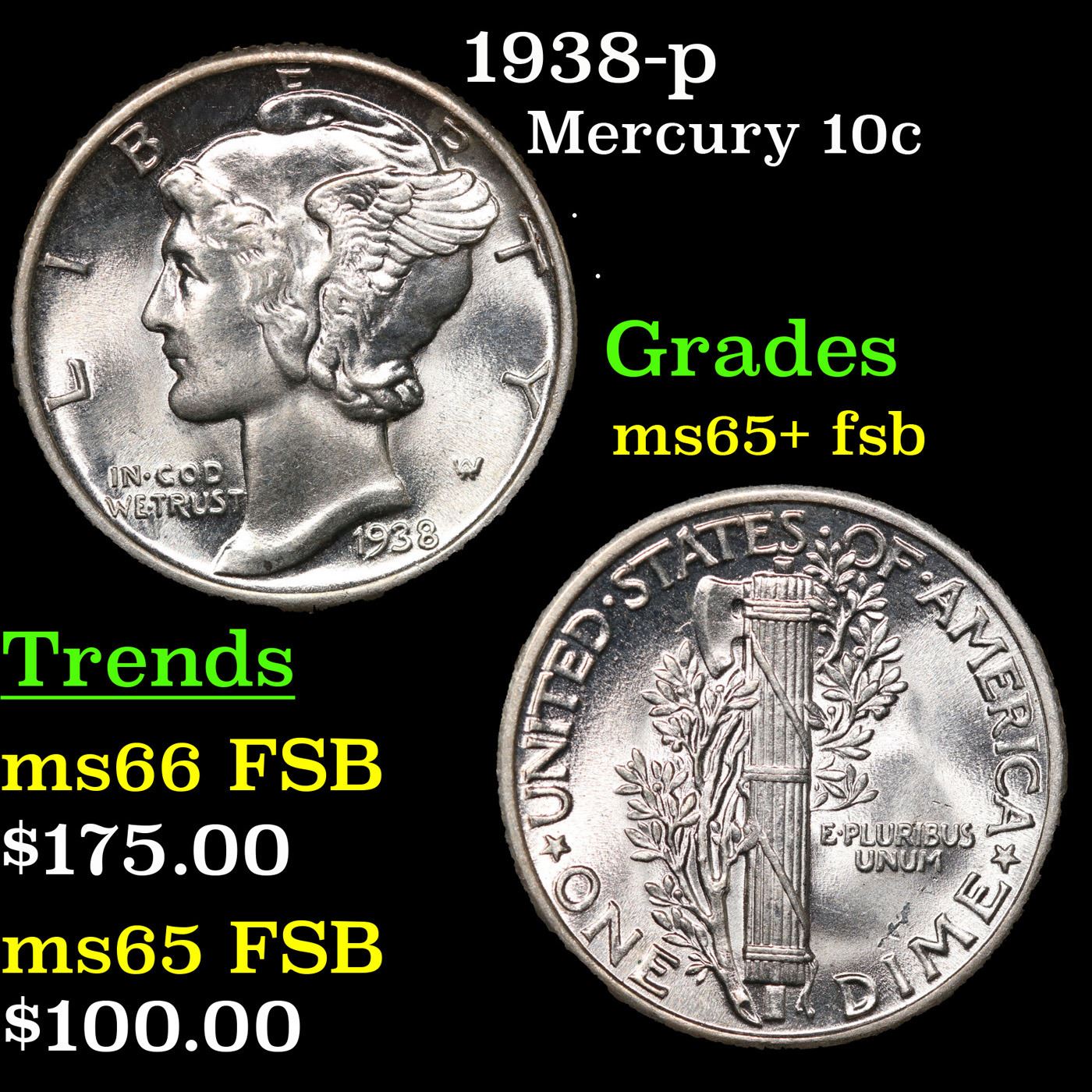 1938-p Mercury Dime 10c Grades GEM+ FSB.
