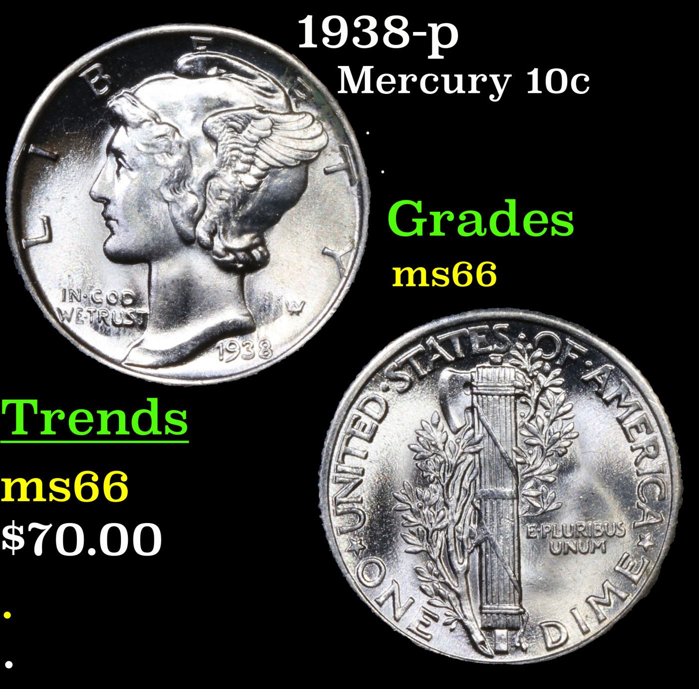 1938-p Mercury Dime 10c Grades GEM+ Unc.