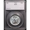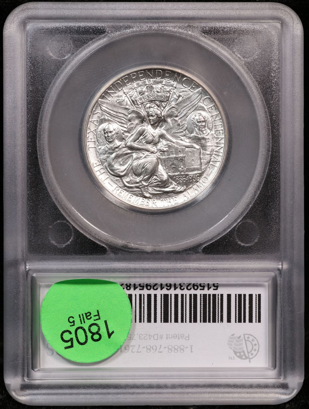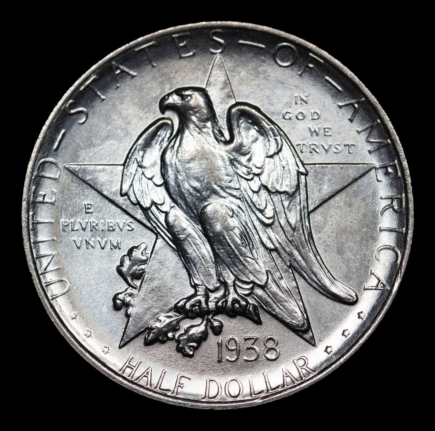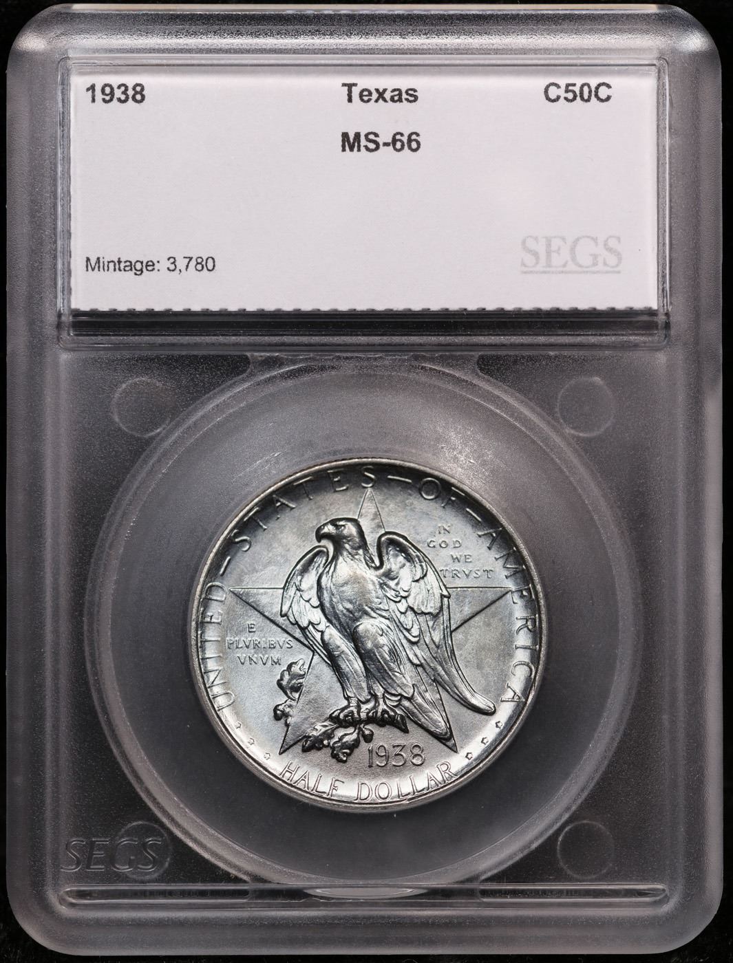 1938-p Texas Old Commem Half Dollar 50c Graded ms66 By SEGS. The Texas Centennial half dollar commemorative coin was minted to honor the Centennial of Texas's independence from Mexico. Early in the administration of President Franklin Delano Roosevelt, on June 15, 1933, Congress passed an act to authorize the coinage of silver half dollars "in commemoration of the one hundredth anniversary in 1936 of the independence of Texas, and of the noble and heroic sacrifices of her pioneers, whose revered memory has been an inspiration to her sons and daughters during the past century." The Texas commemorative series ran from 1934 thru 1938 and 13 different dates and mint mark combinations were issued. For each of the years 1935 thru 1938, coins were struck at all three Mints; Philadelphia, Denver, and San Francisco. But for the 1934 Texas, only Philadelphia Mint coins were issued. The original issue price was $1.00 per coin.The coin was designed by Pompeo Coppini, a Texan. The obverse depicts an Eagle sitting on a branch in front of the Lone Star, the symbol of Texas. The reverse depicts the goddess Victory spreading her wings over the Alamo. It also depicts Sam Houston on her left and Stephen F. Austin on her right. The Six Flags of Texas fly above her head. Under her it reads REMEMBER THE ALAMO. Over Sam Houston, Victory, and Stephen F. Austin it reads THE TEXAS INDEPENDENCE CENTENNIAL. A Corey's Pick, Bid to Win Coin