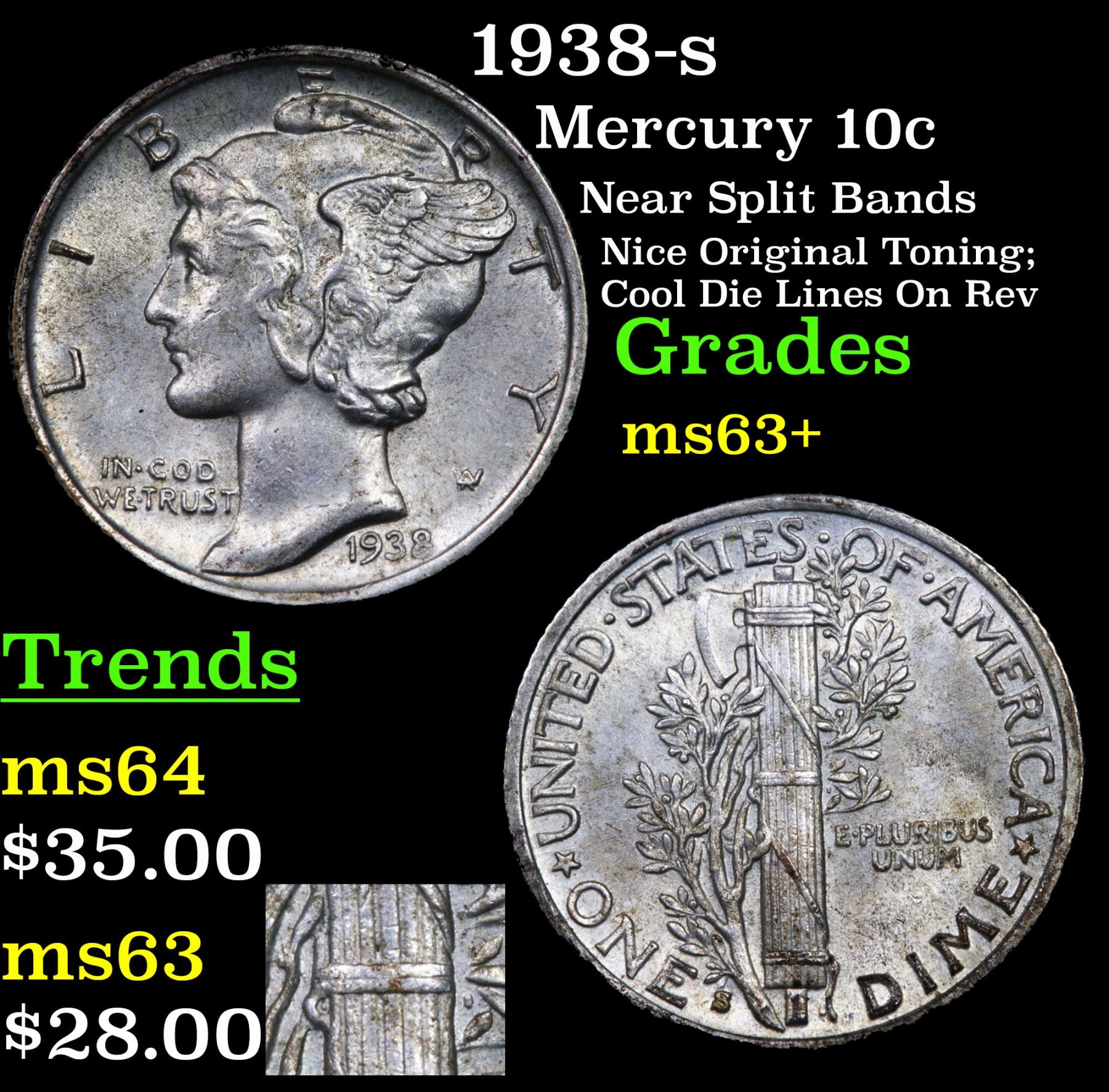 1938-s Mercury Dime 10c Grades Select+ Unc.