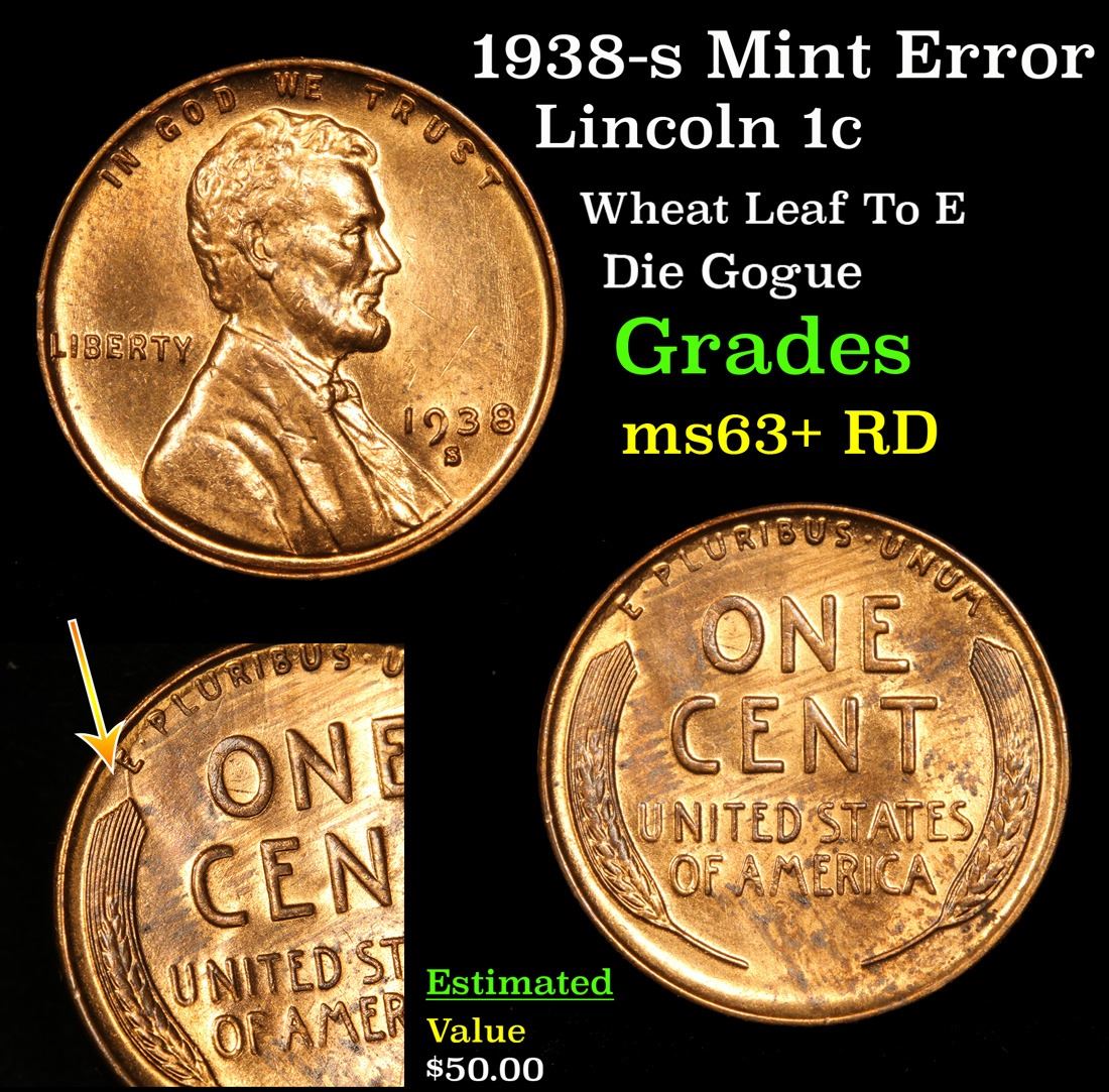 1938-s Mint Error Wheat Leaf To E Die Gogue Lincoln Cent 1c Grades Select+ Unc RD.