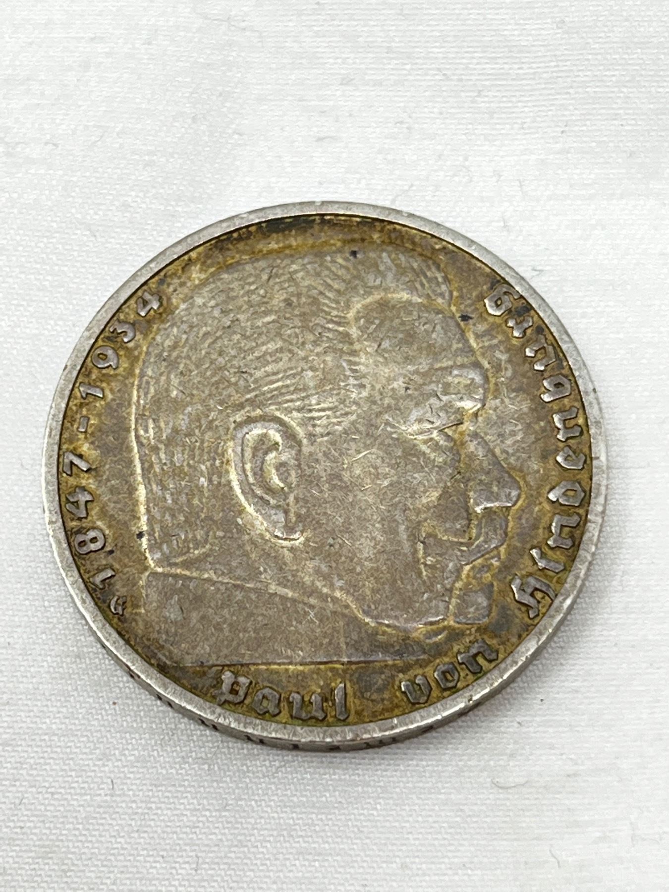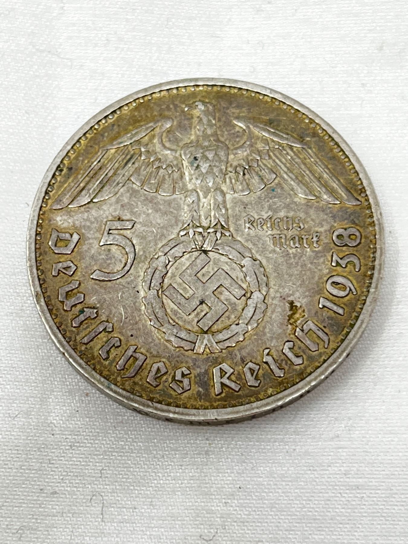 Karlsruhe mint, 1938 Nazi issued silver 5 mark coin with hindenburg on back and nazi eagle on front.