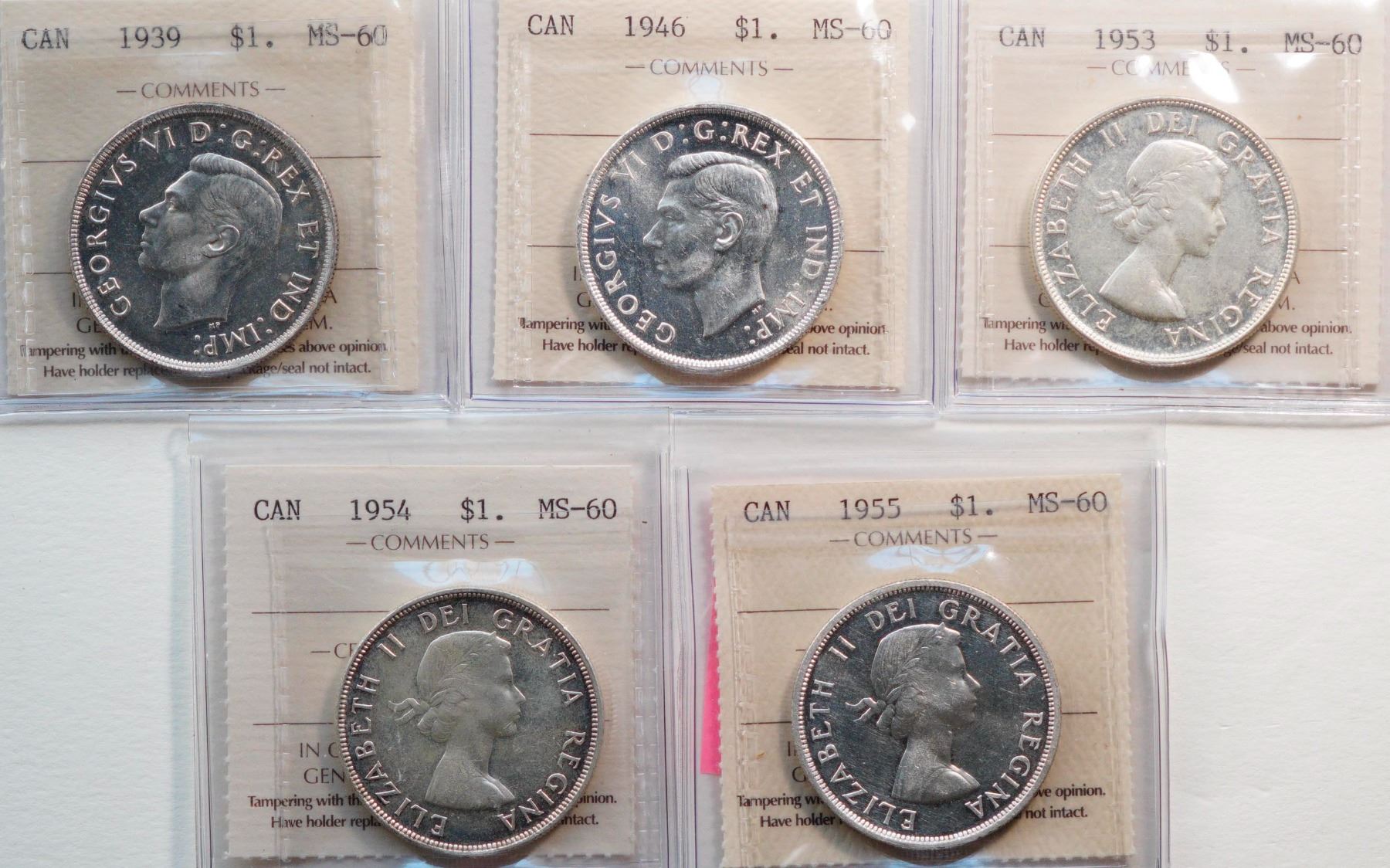 1939 $1, 1946, 1953 "NSF", 1954, 1955, All 5 coins ICCS Mint State-60