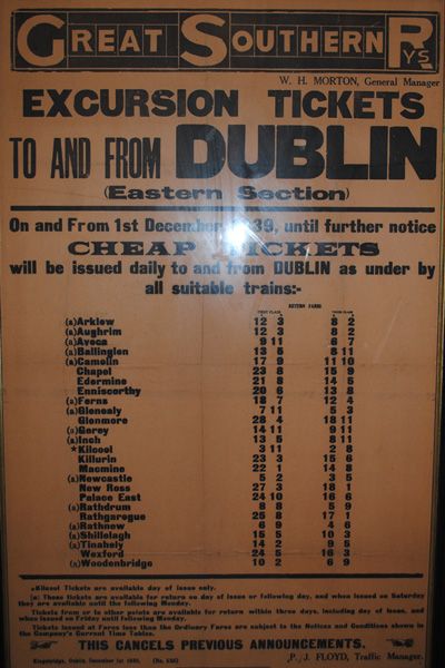 Large framed poster issued from Kingsbridge, Dublin advertising excursion tickets to and from Dublin (Eastern Section) Listing stations and ticket prices. Also with framed Sligo, Leitrim and Northern Counties Railway letterpress poster dated 1 August 1922 and listing a table of offences and penalties of the railway. (2 items)