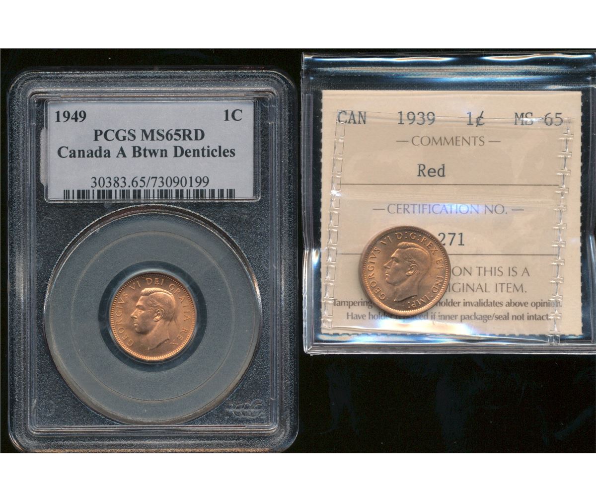 1939 1¢ ICCS MS65 & 1949 A Betw PCGS MS65RD. Lot of 2 coins.